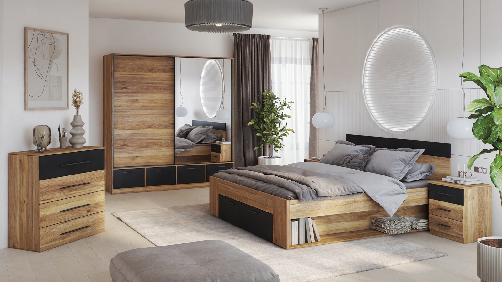 Kolekcja do sypialni Beta w odcieniu dębu Mauvlla z dodatkiem czarnego to doskonałe połączenie klasyki z nowoczesnością, które zadowoli nawet najbardziej wymagających użytkowników. Kolekcja Beta charakteryzuje się eleganckim designem, który harmonijnie łączy naturalne piękno dębu Mauvlla z nowoczesnymi akcentami czerni. Dąb Mauvlla, o ciepłym i przytulnym odcieniu, wprowadza do wnętrza atmosferę spokoju i komfortu. Kontrastowe czarne elementy dodają całości wyrazistości i nowoczesnego sznytu, tworząc jednocześnie wrażenie harmonii i równowagi. Meble z kolekcji Beta są zaprojektowane z myślą o funkcjonalności i komforcie użytkowania. Szafy, komody i łóżka wyposażone są w przestronne szuflady i półki, które pomogą w utrzymaniu porządku w sypialni. Dzięki swojemu uniwersalnemu designowi, kolekcja Beta doskonale wpasuje się w różnorodne aranżacje wnętrz, zarówno te klasyczne, jak i bardziej nowoczesne. Neutralna kolorystyka i elegancka forma sprawiają, że meble te staną się ozdobą każdej sypialni, dodając jej wyjątkowego charakteru.