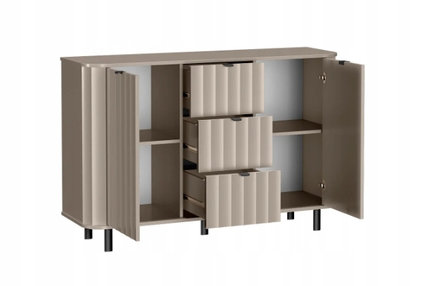 Komoda NOVADO NO-1 to doskonałe połączenie elegancji i funkcjonalności, które sprawdzi się w nowoczesnych wnętrzach. Dzięki symetrycznej budowie – z trzema pojemnymi szufladami w środkowej części oraz dwoma szafkami z półkami po bokach – zapewnia wygodne przechowywanie różnorodnych przedmiotów. Idealna do salonu i sypialni.