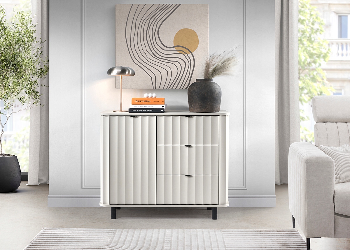 Biała Komoda Novado 137,5 x 40,6 x 91 biel alpejska EGGER ryflowana