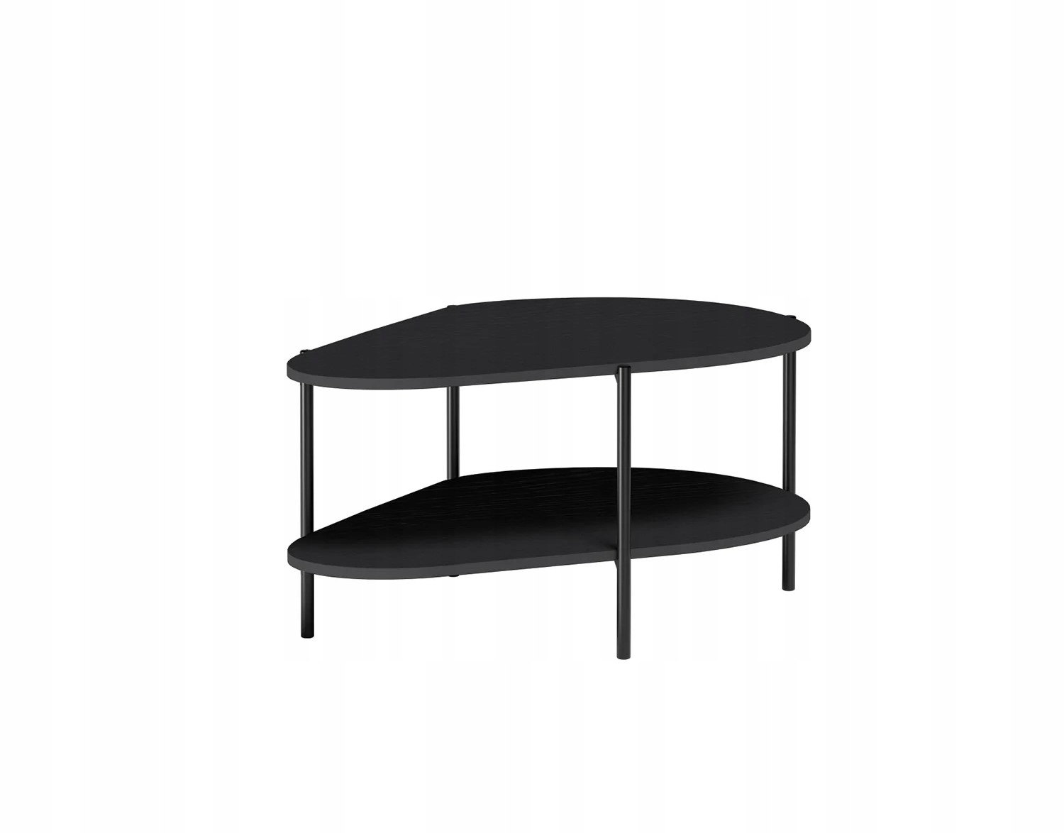 Nowoczesny stolik kawowy o organicznym kształcie i dwupoziomowej konstrukcji. Elegancka czerń, solidna metalowa rama i dodatkowa półka łączą styl z funkcjonalnością, idealnie komponując się z nowoczesnymi wnętrzami.
