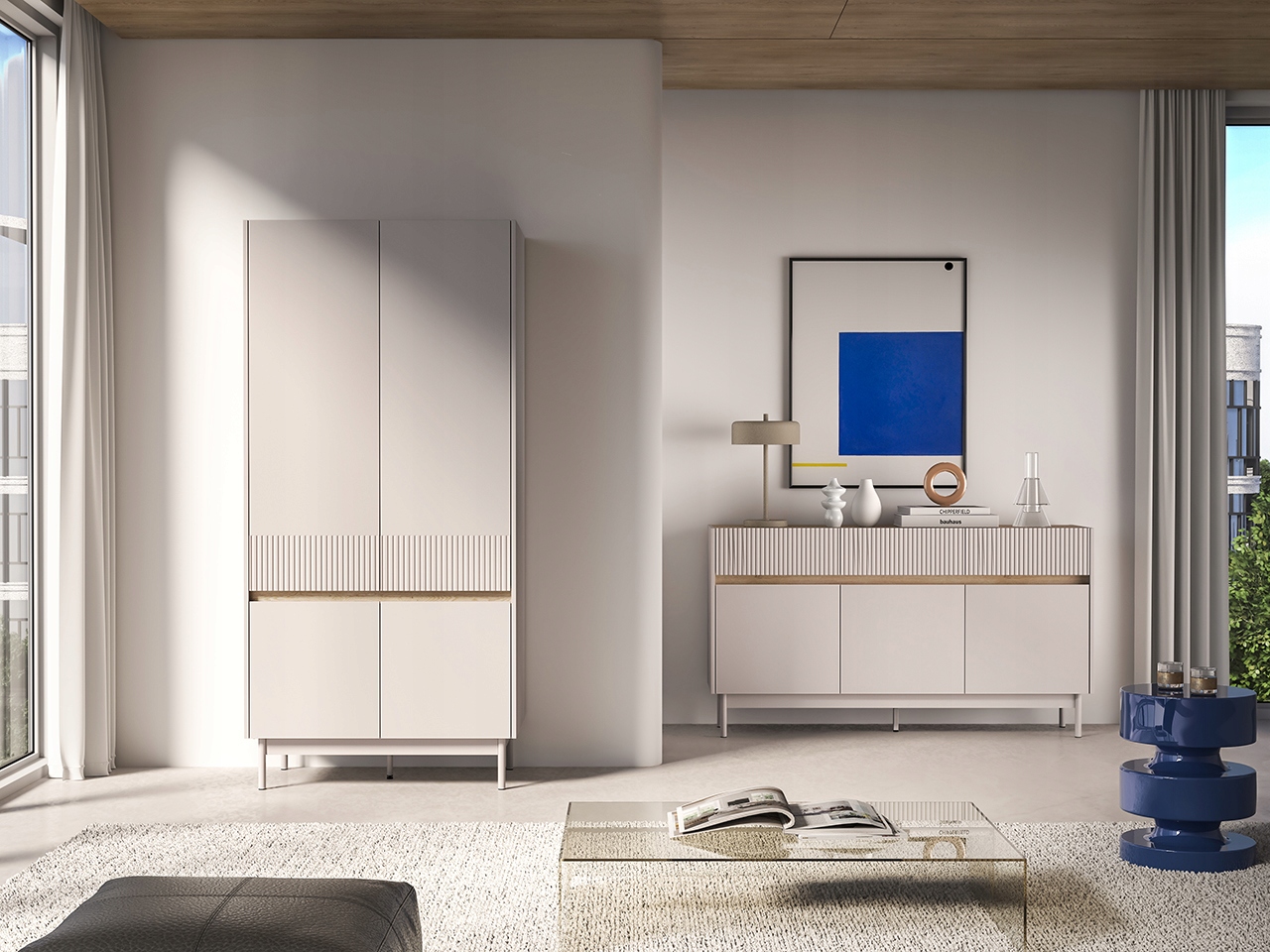 - Fronty z matowego MDF w odcieniu cashmere, podkreślające elegancki styl kolekcji