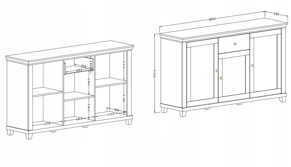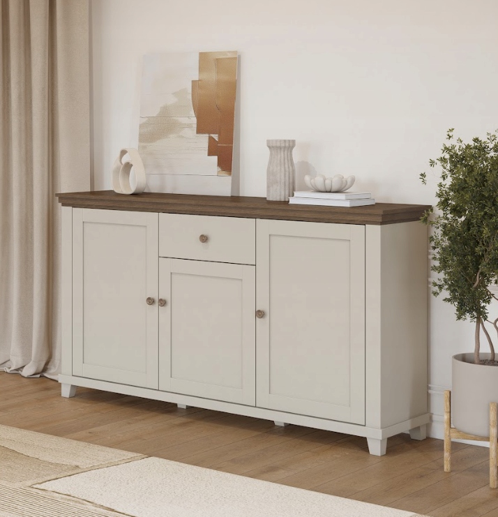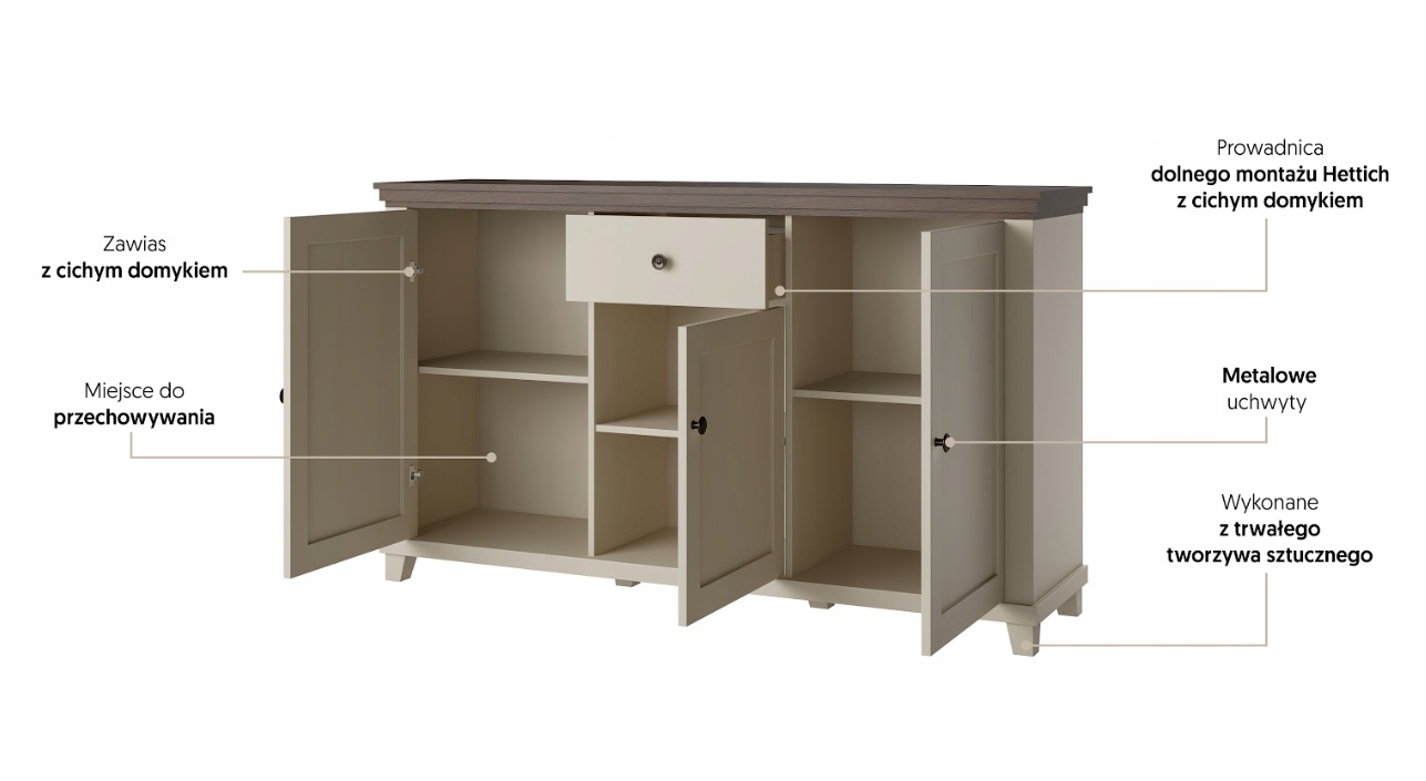 - Pojemność bez Kompromisów: Szerokość 181 cm oferuje ogromną przestrzeń do przechowywania. Trzy zamykane szafki oraz szeroka szuflada pomogą Ci zaprowadzić idealny porządek w salonie lub jadalni.