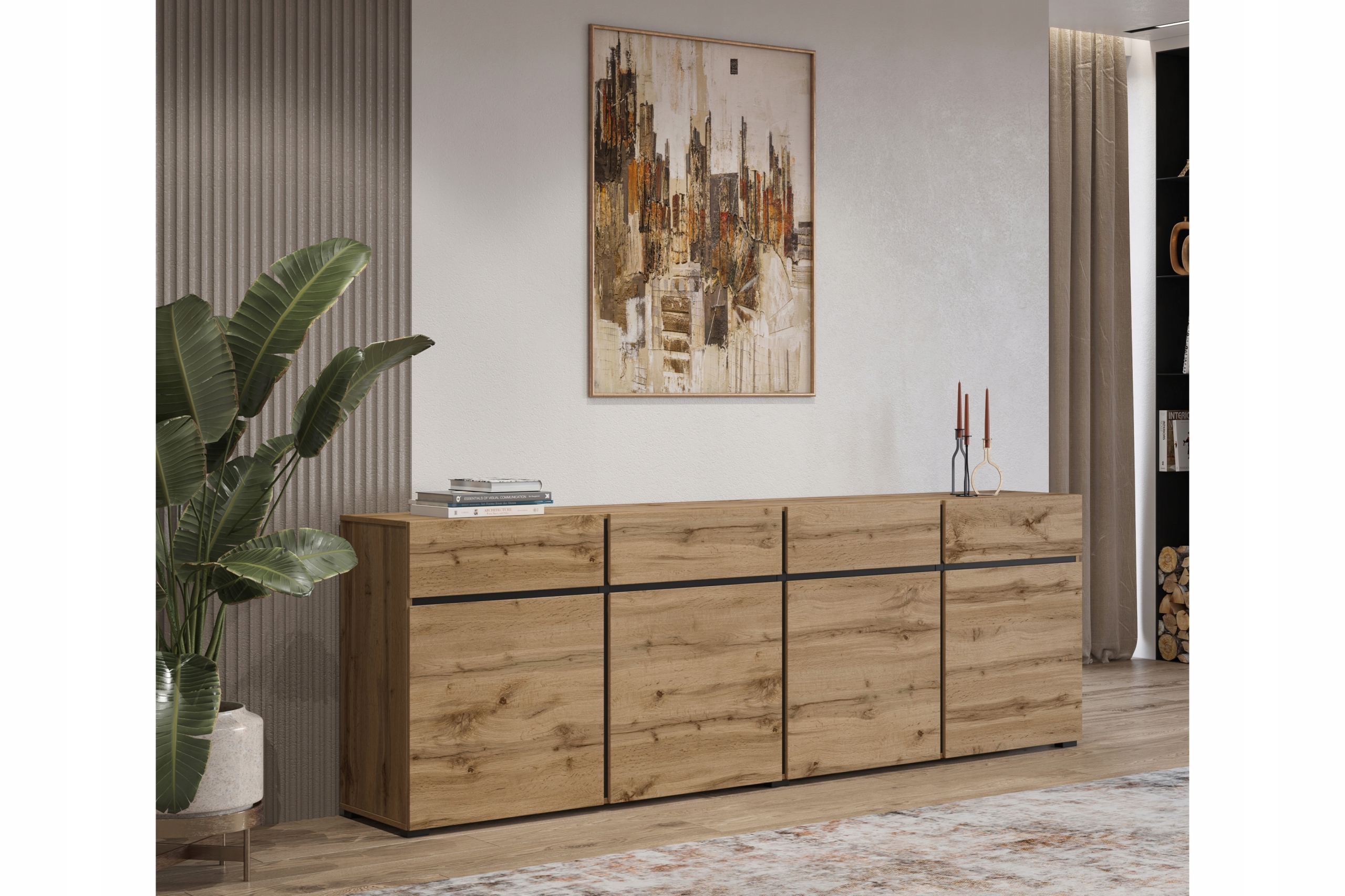 4 drzwi, 4 półki i 4 szuflady zapewniają mnóstwo miejsca na przechowywanie różnych przedmiotów, co sprawia, że ten mebel jest nie tylko piękny, ale także praktyczny.
