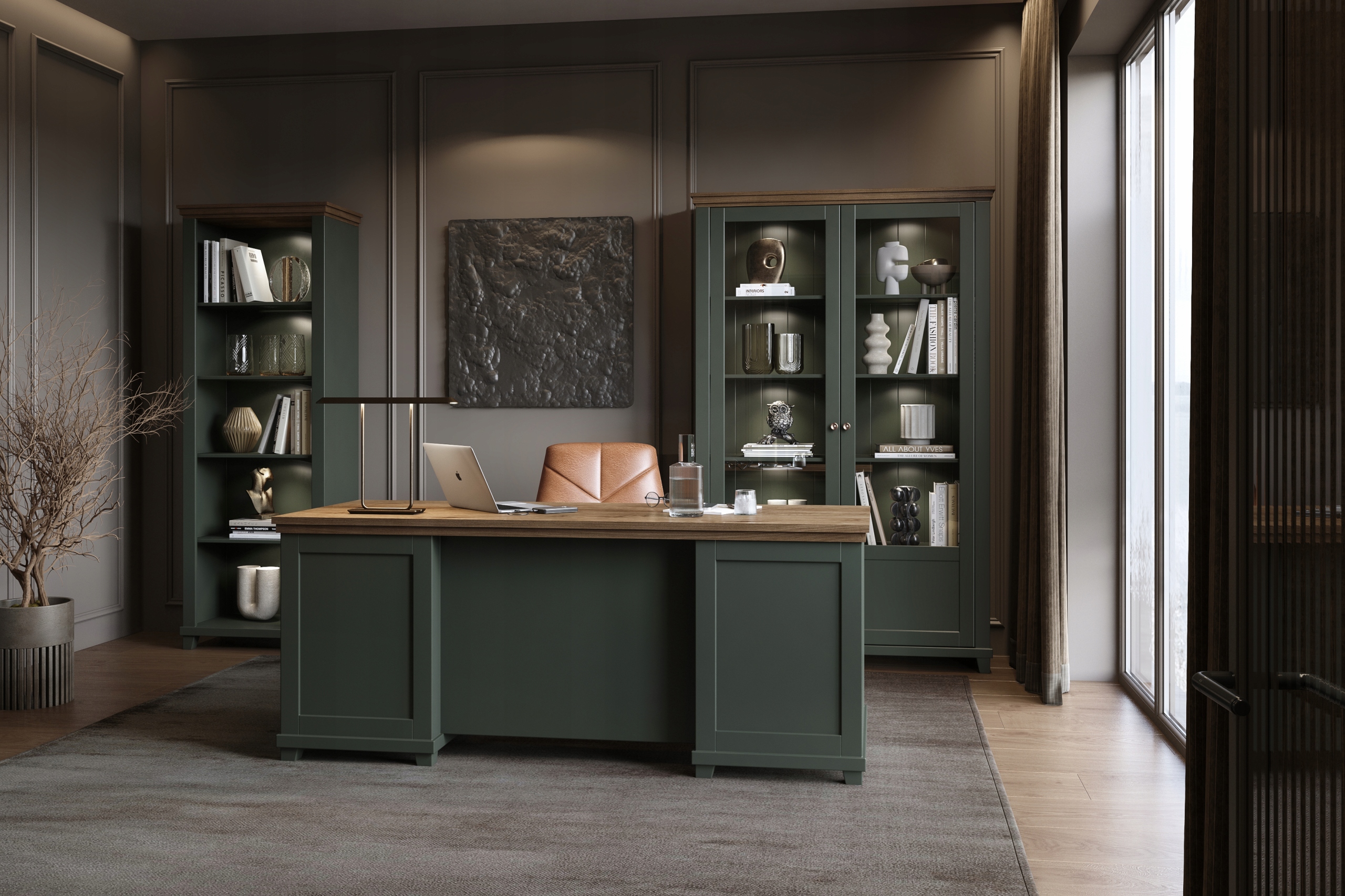 To biuro to idealne połączenie klasycznej formy z nowoczesną elegancją. Meble w głębokim, zielonym kolorze o odcieniu butelkowej zieleni tworzą wysmakowaną, wyciszoną przestrzeń sprzyjającą skupieniu i pracy. Ich drewniane blaty w naturalnym wybarwieniu dodają ciepła, a zarazem podkreślają wysoką jakość wykonania.