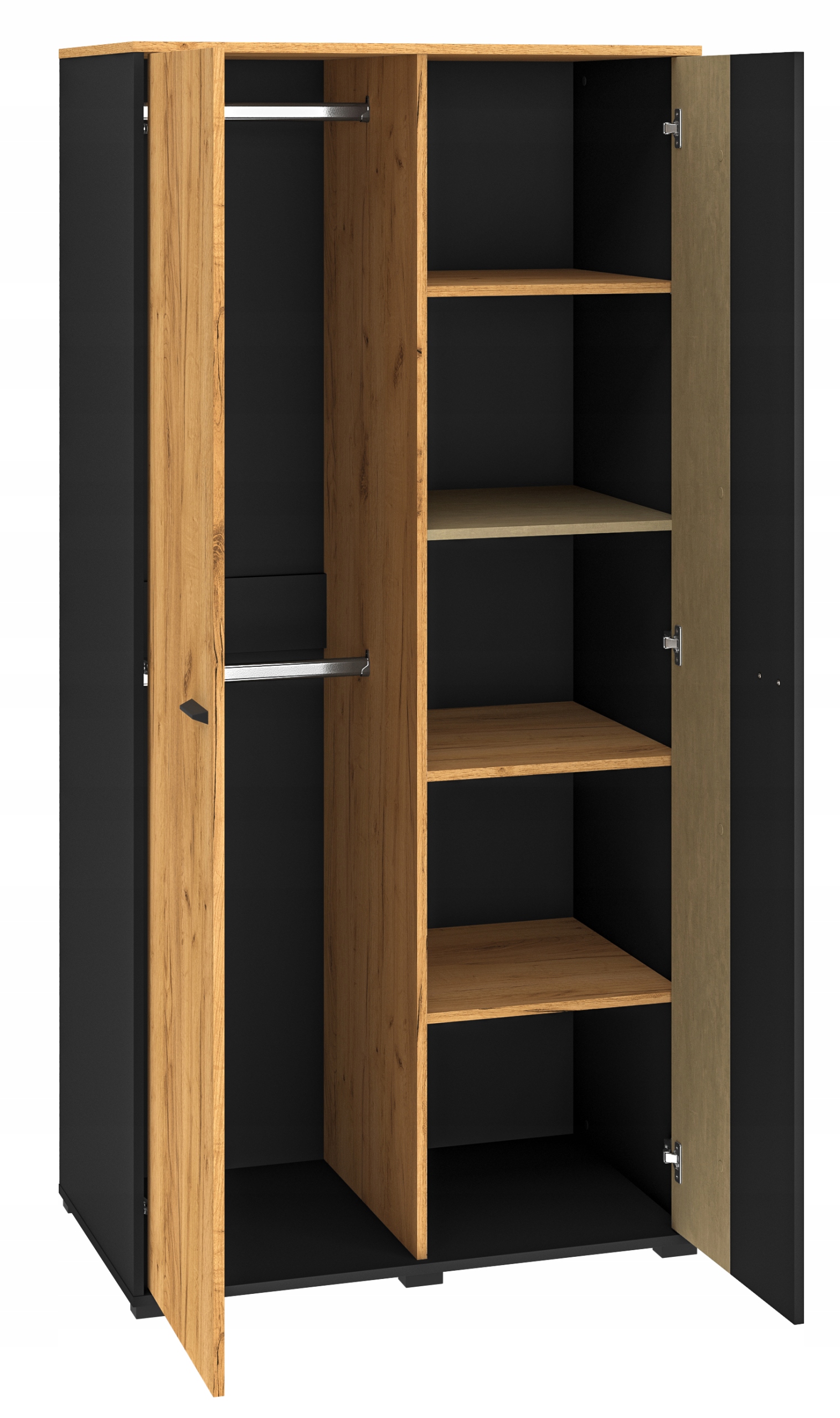 - Perfekcyjna organizacja: Wnętrze szafy zostało zaprojektowane tak, aby pomieścić wszystko – od ubrań wiszących po drobne akcesoria. Posiada aż 4 pojemne półki oraz 2 drążki na ubrania.