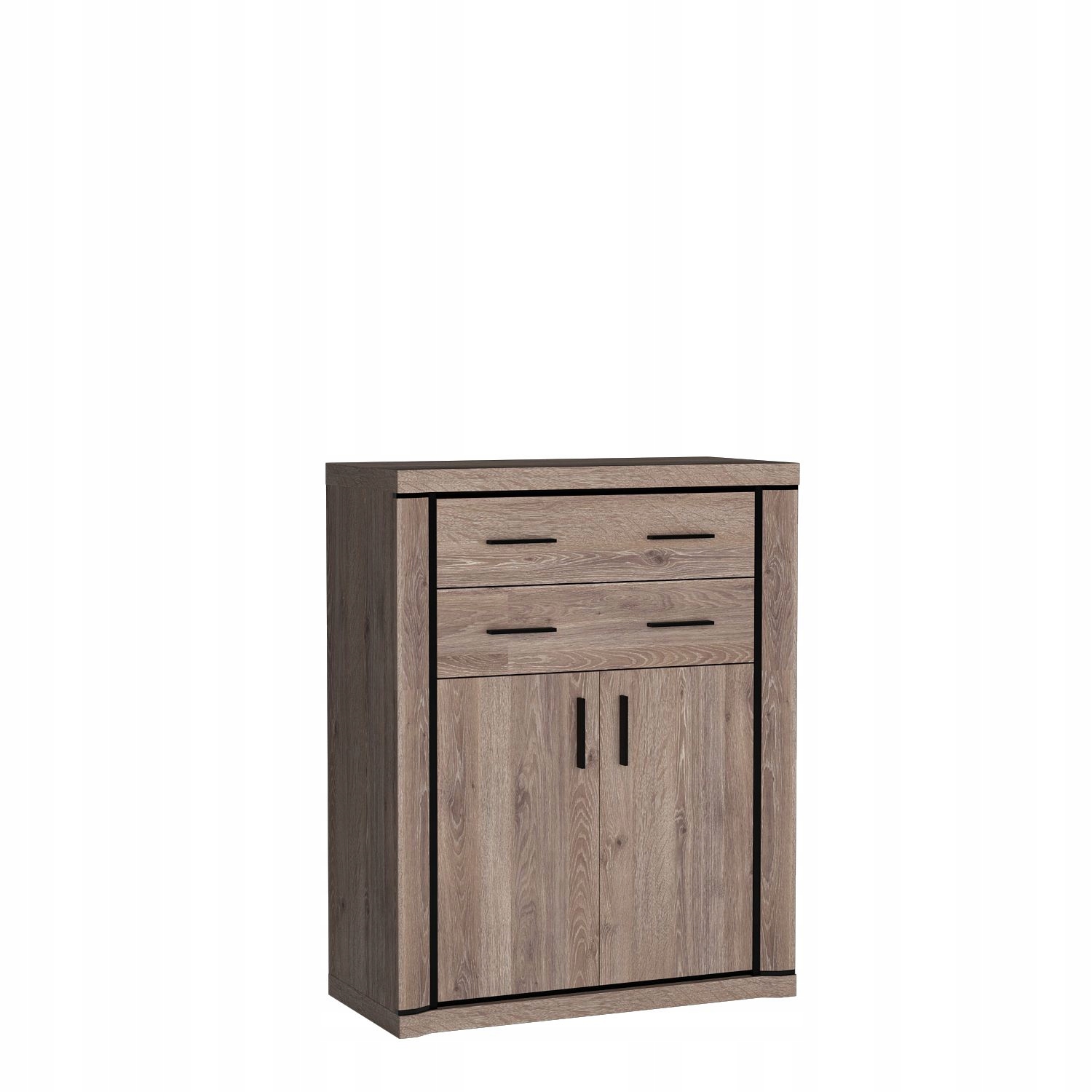 Wysoka komoda z kolekcji Dallas, posiadająca dwie duże szuflady oraz połączoną jedną szafkę, za którą kryje się pojemna półka dzieląca przestrzeń na pół, jest idealna do organizacji. Dzięki niej można zagospodarować swoje ubrania oraz różne akcesoria na wiele sposobów. Czarne wstawki w postaci listew sprawiają, że łamie standardy, jest oryginalna i dodaje mocniejszego akcentu. Metalowe uchwyty świetnie się z nimi komponują. Komoda daje możliwość stworzenia wielu aranżacji, sama czy w zestawie będzie wyglądać oszałamiająco. Dostępna w dwóch wybarwieniach.