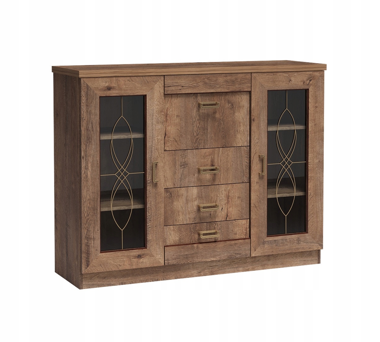 Wysoka komoda z barkiem oraz przeszklonymi frontami z szykownym wzorkiem. Świetnie sprawdzi się w salonie lub jadalni. Pojemna i elegancka z trzema szufladami.