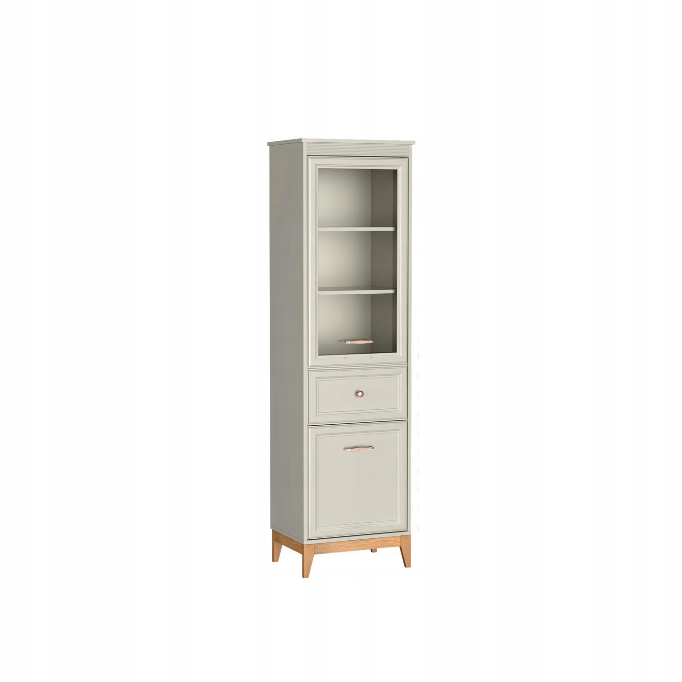 Górna część witryny to przeszklone drzwi z delikatnym frezowaniem, za którymi znajdują się dwie praktyczne półki. Dzięki nim można stylowo zaprezentować zastawę stołową, dekoracje czy książki. Poniżej umieszczono pojemną szufladę, idealną na drobiazgi, oraz zamykaną szafkę zapewniającą miejsce na większe przedmioty.