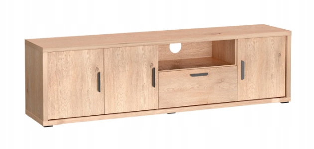 Po lewej stronie znajdują się dwie zamykane szafki, a po prawej – trzecia szafka. Centralna część mebla to otwarta wnęka, idealna na dekoder, soundbar lub konsolę, oraz praktyczna szuflada z systemem cichego domyku, który podnosi komfort użytkowania i dodaje całości elegancji.