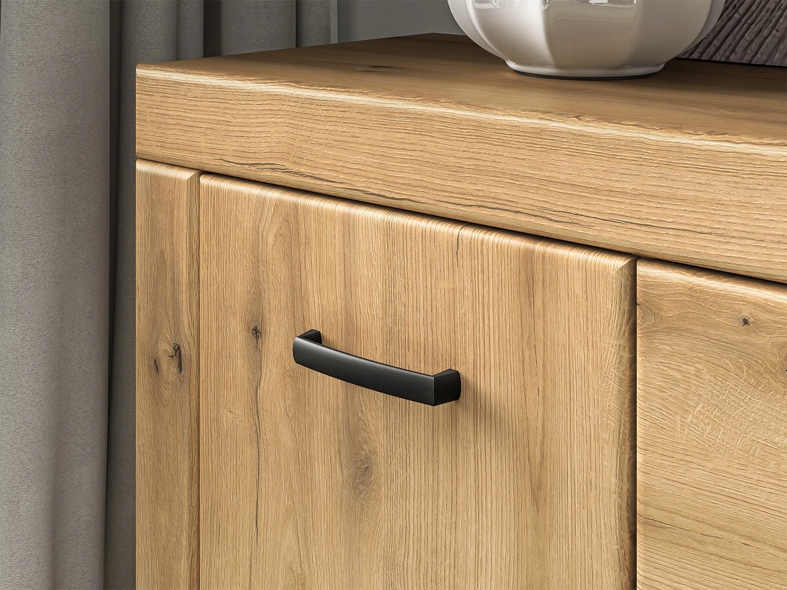 Dora to kolekcja pięknych i funkcjonalnych mebli do Twojego salonu. Bryły utrzymane są w naturalnej kolorystyce dębu Evoke. Wyraźny rysunek usłojenia podkreśla niepowtarzalny styl mebla. Oryginalnie zaoblone fronty oraz listwy z płyty MDF dodadzą wnętrzu przyjaznego charakteru i przytulności. Czarne uchwyty w połączeniu z dekorem o jasnym, drewnianym wzorze tworzą idealny, dopełniający się kontrast. Starannie wyselekcjonowane typy brył pozwolą zaaranżować wiele wnętrz, niezależnie od ich stylu czy metrażu. Wybierz meble Dora i wypełnij serce swojego domu unikalnym wzornictwem.
