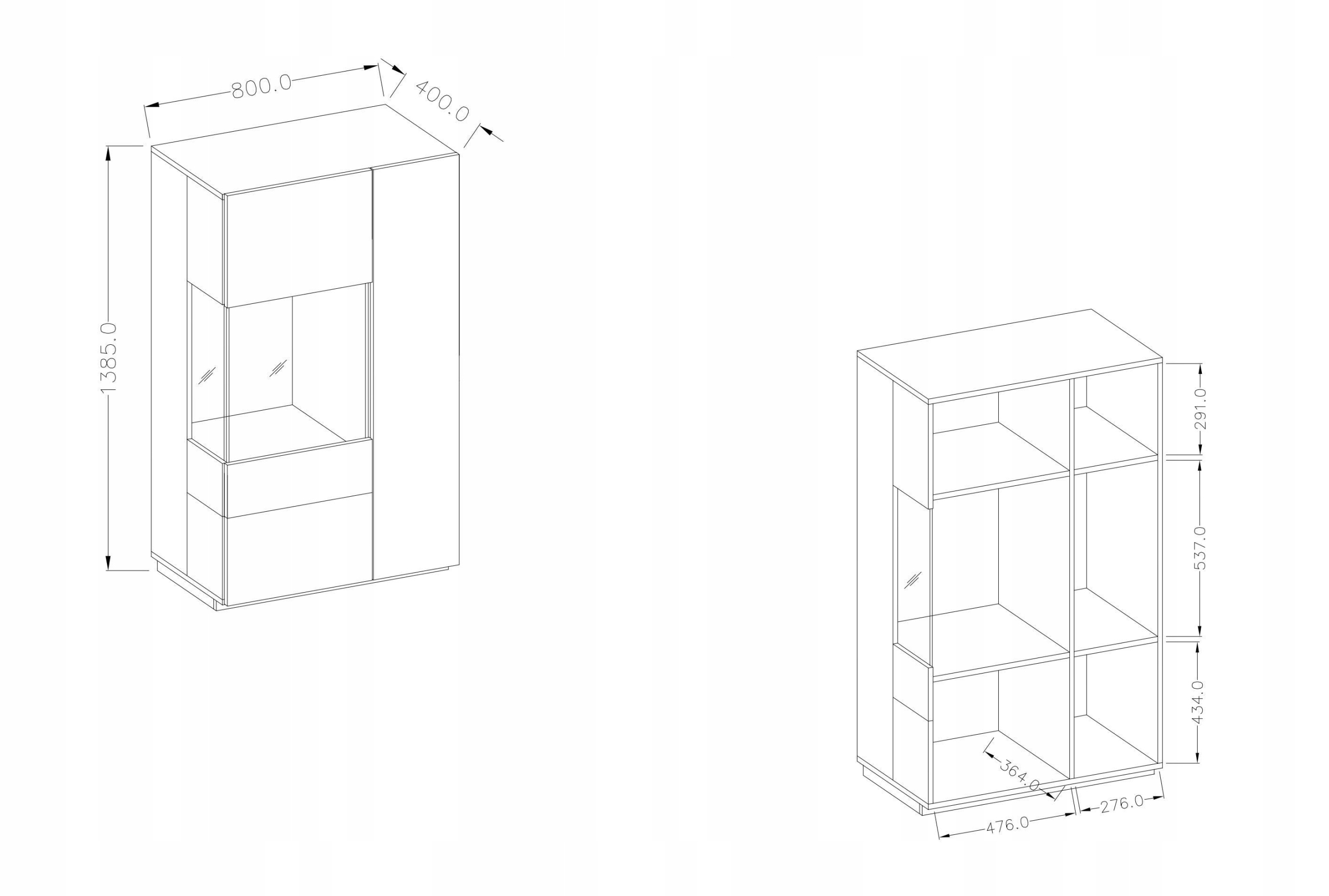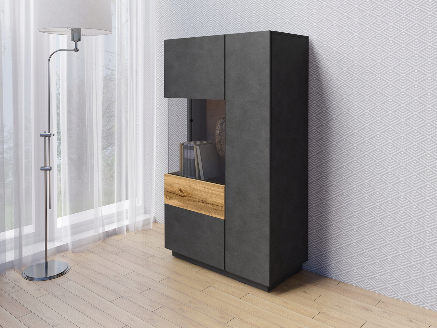 SILKE 42 wysoka komoda dwudrzwiowa z przeszklonym frontem. Elegancki, prosty design sprawdzi się w nowoczesnych aranżacjach. Wykonana z wysokiej jakości płyty meblowej w kolorze matera – dąb wotan. Oświetlenie LED za dopłatą .
