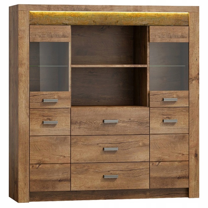 Duża komoda, która dobrze sprawdzi się w twoim domu. Posiada trzy pojemne szuflady oraz pięć półek, na których będzie można przechować ozdoby, pamiątki, zestawy porcelany, drobiazgi i nie tylko. Szklane fronty uczynią ją oryginalną oraz nadadzą świetnej atmosfery w pokoju. Możliwa jest opcja z pełnymi frontami. Komoda zrobiona jest z grubych i dobrych jakości płyt laminowanych oraz metalowych uchwytów, które podkreślają solidność mebla. Dostępna w trzech wybarwieniach.