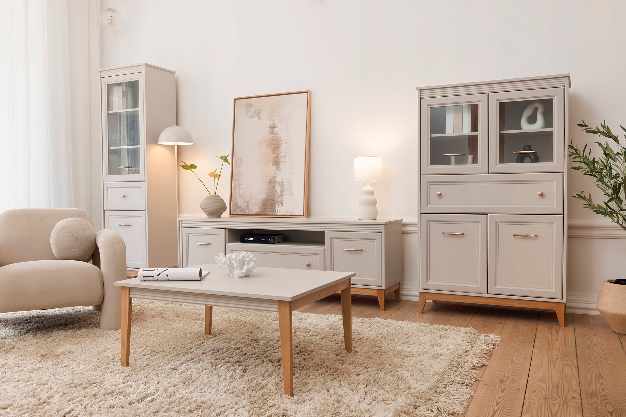 Kolekcja Windsor to połączenie ponadczasowego stylu z funkcjonalnością, które wprowadzi do Twojego wnętrza harmonię i elegancję. Subtelne frezowania na frontach, minimalistyczne uchwyty oraz doskonale dobrane proporcje nadają meblom wyjątkowy charakter. Design, który dopasuje się do każdego wnętrza. Delikatna, naturalna kolorystyka kolekcji WINDSOR sprawia, że doskonale komponuje się zarówno w klasycznych, jak i nowoczesnych aranżacjach. Naturalne drewniane akcenty ocieplają przestrzeń, tworząc przytulny, a jednocześnie stylowy salon.