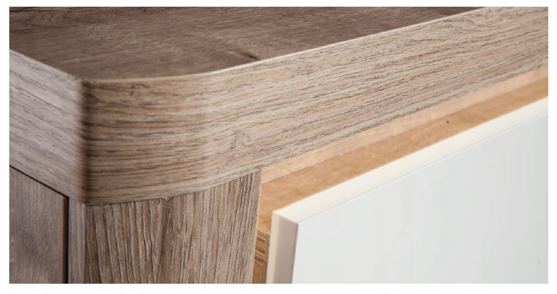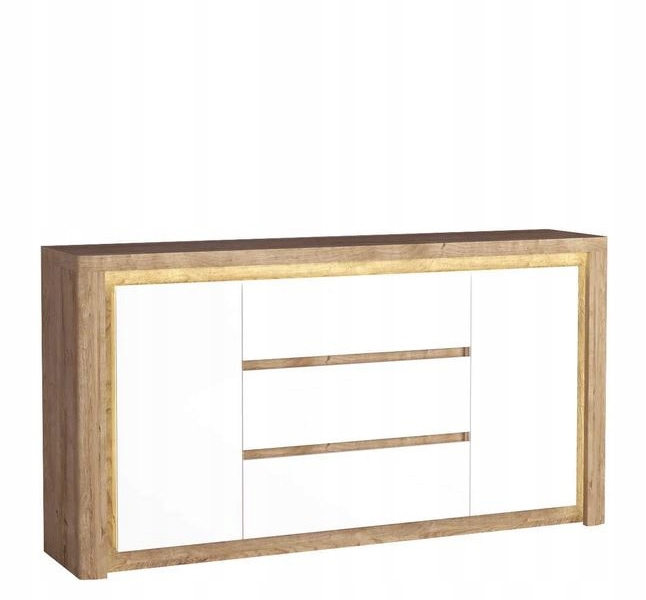 Innowacyjna komoda kombinowana LIVINIO se 3 szufladami w środku i 2 szafkami. Piękny, naturalny kolor w połączeniu z błyszczącymi białymi frontami wygląda bardzo nowocześnie. Komoda jest wyposażona w oświetlenie LED, które sprawia przytulne wrażenie.