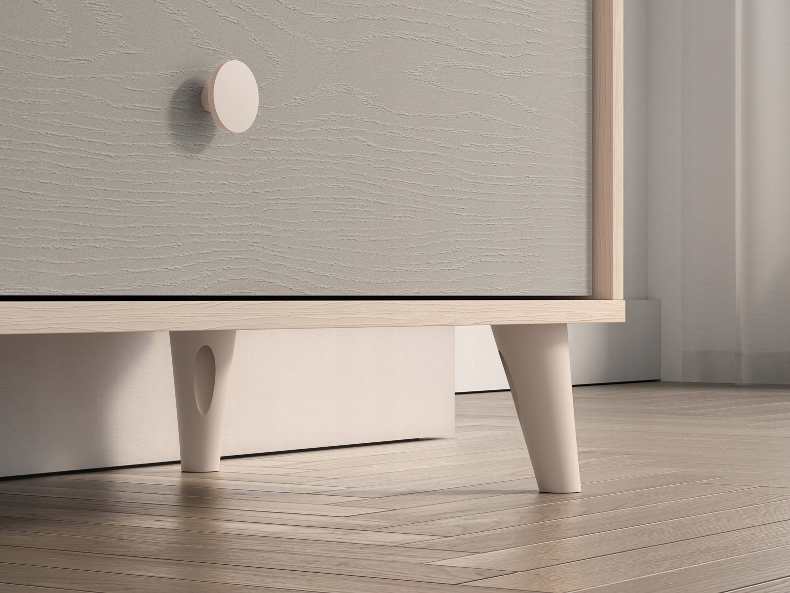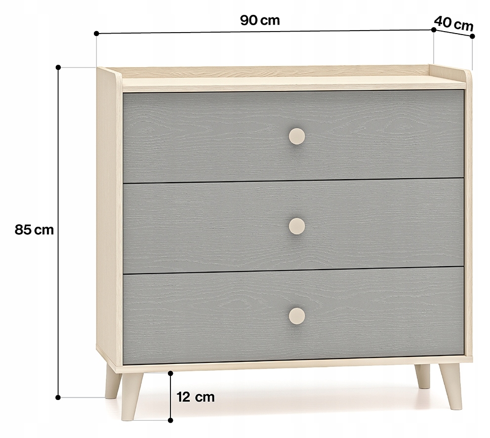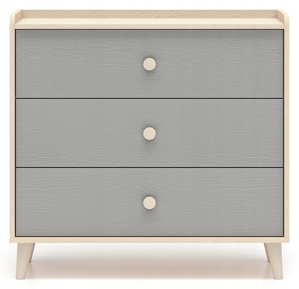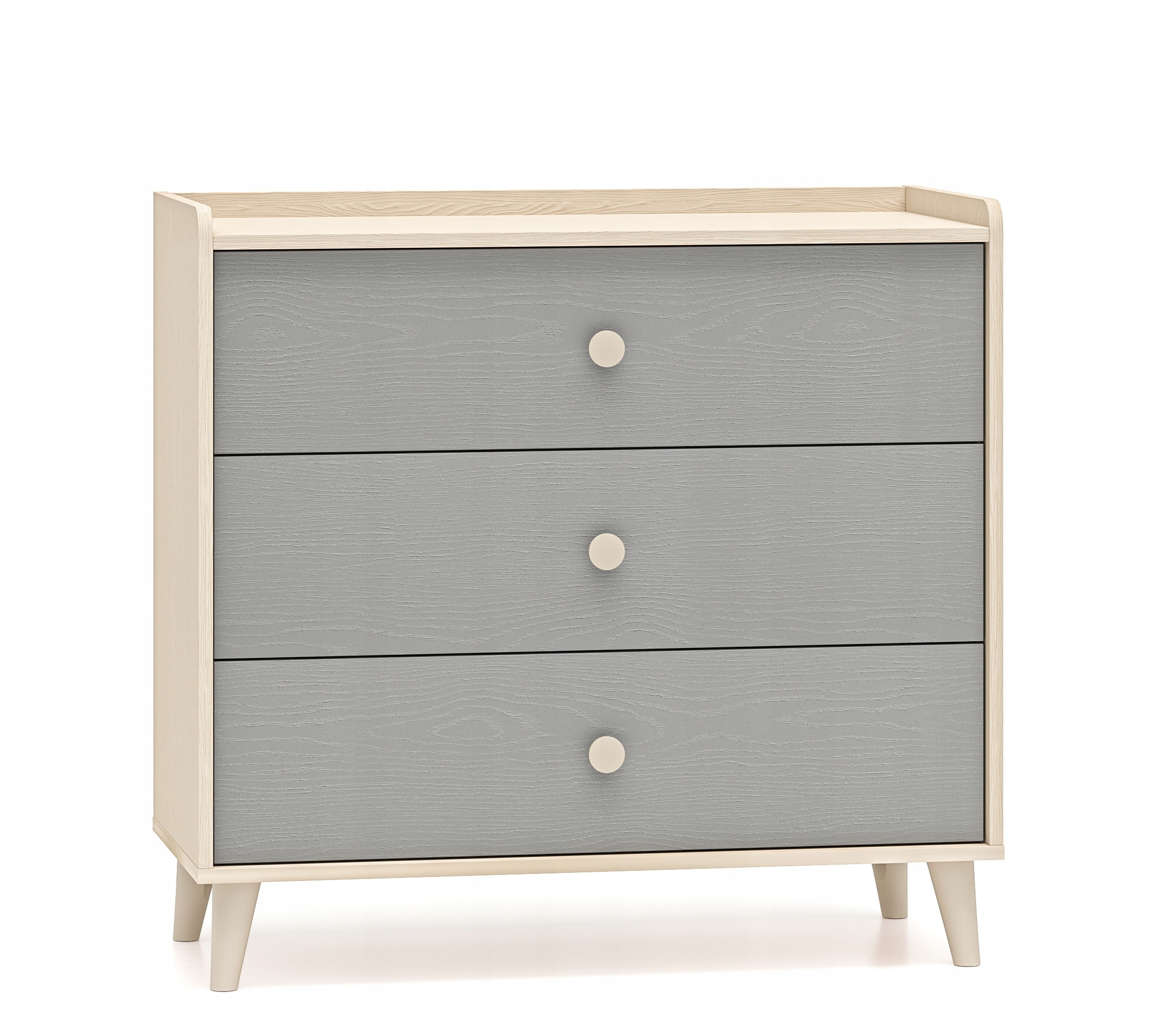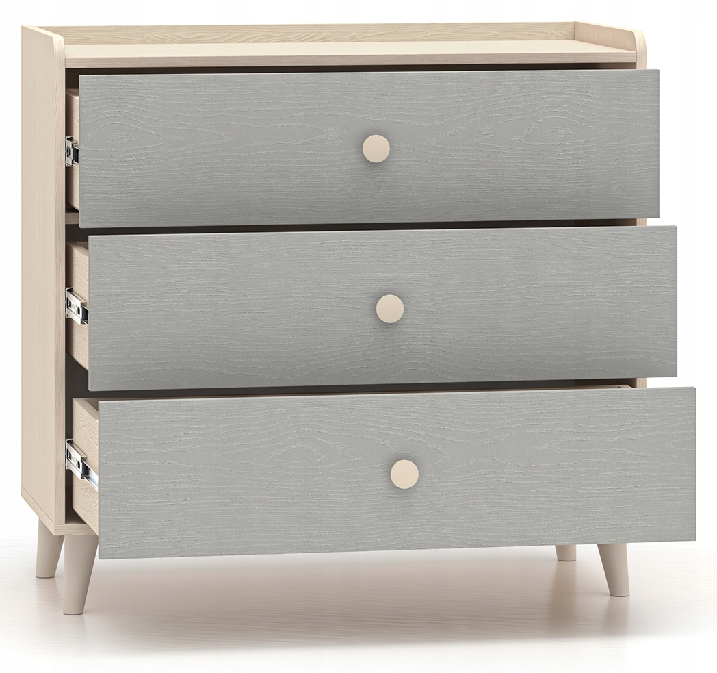 Komoda dla dziecka Mevel ma optymalną wysokość i zaokrąglone kształty, dzięki czemu jest praktyczna i bezpieczna dla najmłodszych użytkowników. Mebel został wykonany z wysokiej jakości płyty laminowanej, odpornej na zarysowania. Posiada również wzmocnione tworzywem ABS krawędzie, które nie ulegają zniekształceniom. Komoda oferuje trzy szuflady wysuwane przy pomocy poręcznych uchwytów meblowych. Jej bryłę osadzono na wysokich nóżkach, dzięki czemu jest ona optycznie lekka i dodaje elegancji aranżacji każdego pokoju dziecięcego.