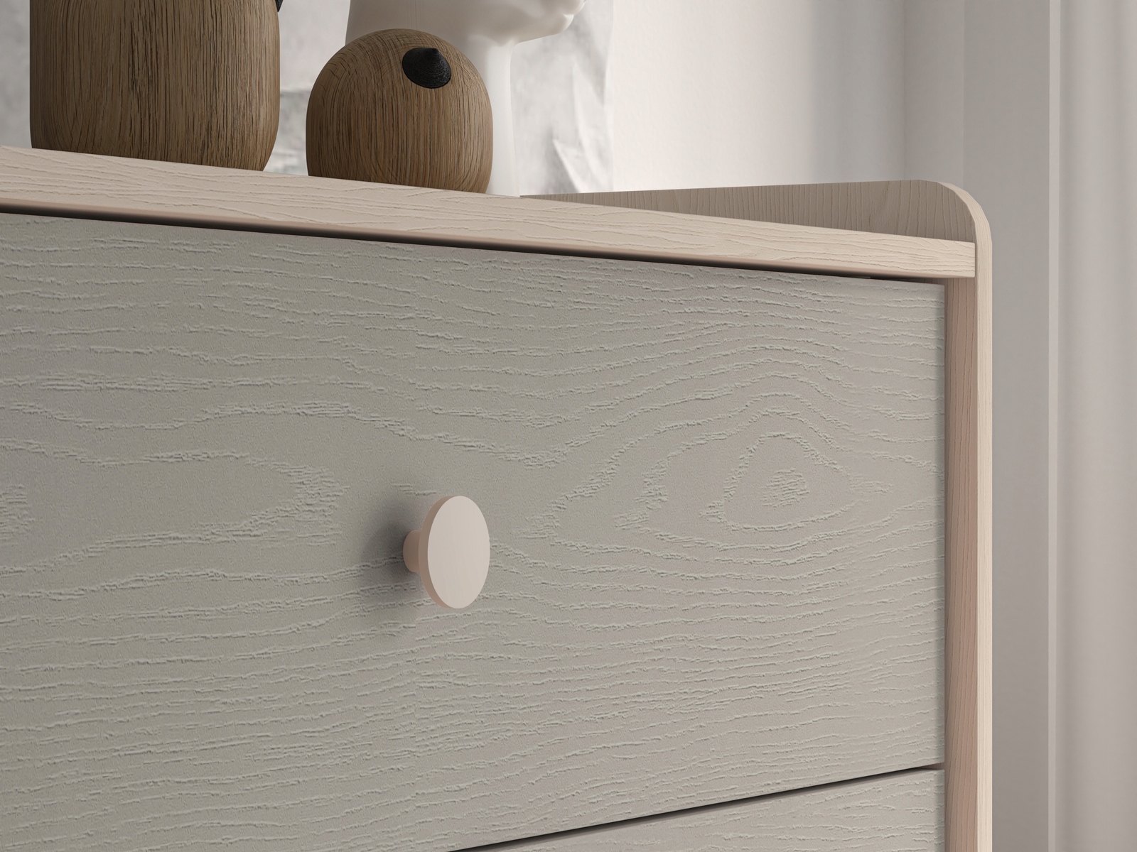 Prezentowana komoda młodzieżowa z kolekcji ML Meble Mevel została wybarwiona na dwa uniwersalne i ponadczasowe odcienie: Piasek Pustyni oraz Szary Pallad. Takie połączenie kolorystyczne nadaje jej subtelny, pastelowy wygląd i sprawia, że mebel skutecznie ociepla wystrój każdej aranżacji. Komoda sprawdzi się zarówno w pokoju dziewczynki, jak i w pokoju chłopca. Nie zajmie też wiele miejsca, jednocześnie tworząc w sypialni praktyczną przestrzeń do przechowywania niezbędnych przedmiotów.