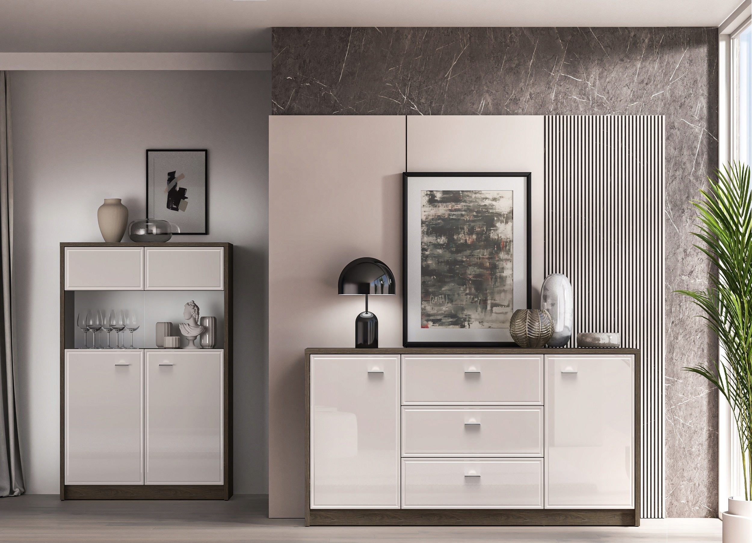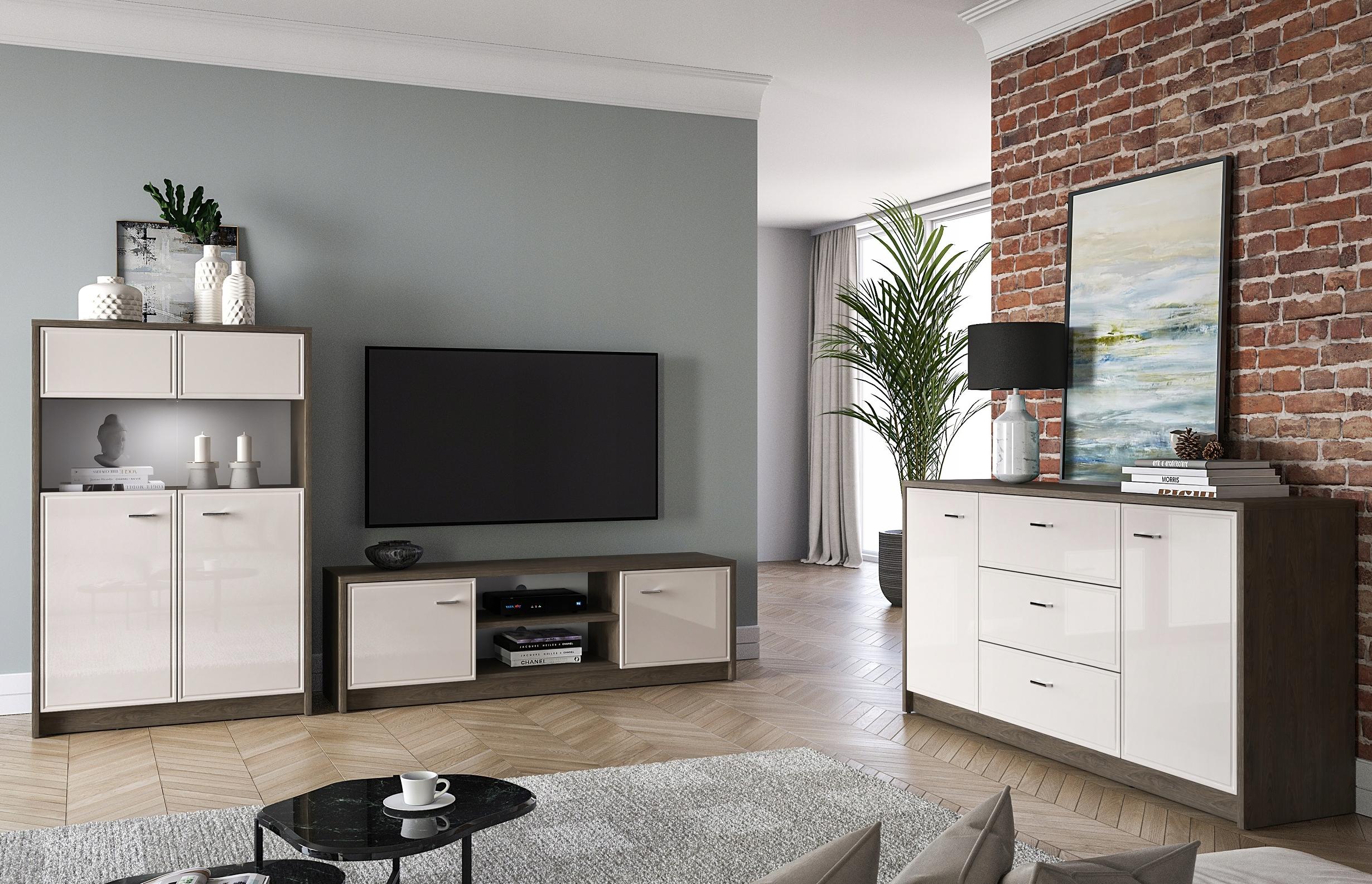 Korpus w ciemnym, wybarwieniu dębu Windmill idealnie współgra z jasnymi frontami w kaszmirowym dekorze. Połyskujące fronty MDF z wyrafinowanym frezowaniem wprowadzą do Twojego wnętrza dużą dozę współczesnej elegancji. Lustrzane, metalowe uchwyty dodatkowo podkreślą styl mebla, stając się swoistą biżuterią we wnętrzu. Starannie dobrana gama brył sprawdzi się w każdym współczesnym salonie i sypialni. Wybierz meble Avante i wypełnij serce swojego domu unikalnym wzornictwem.