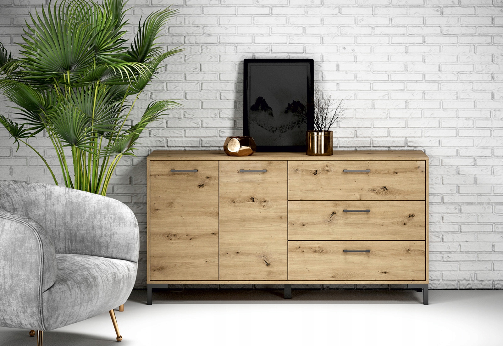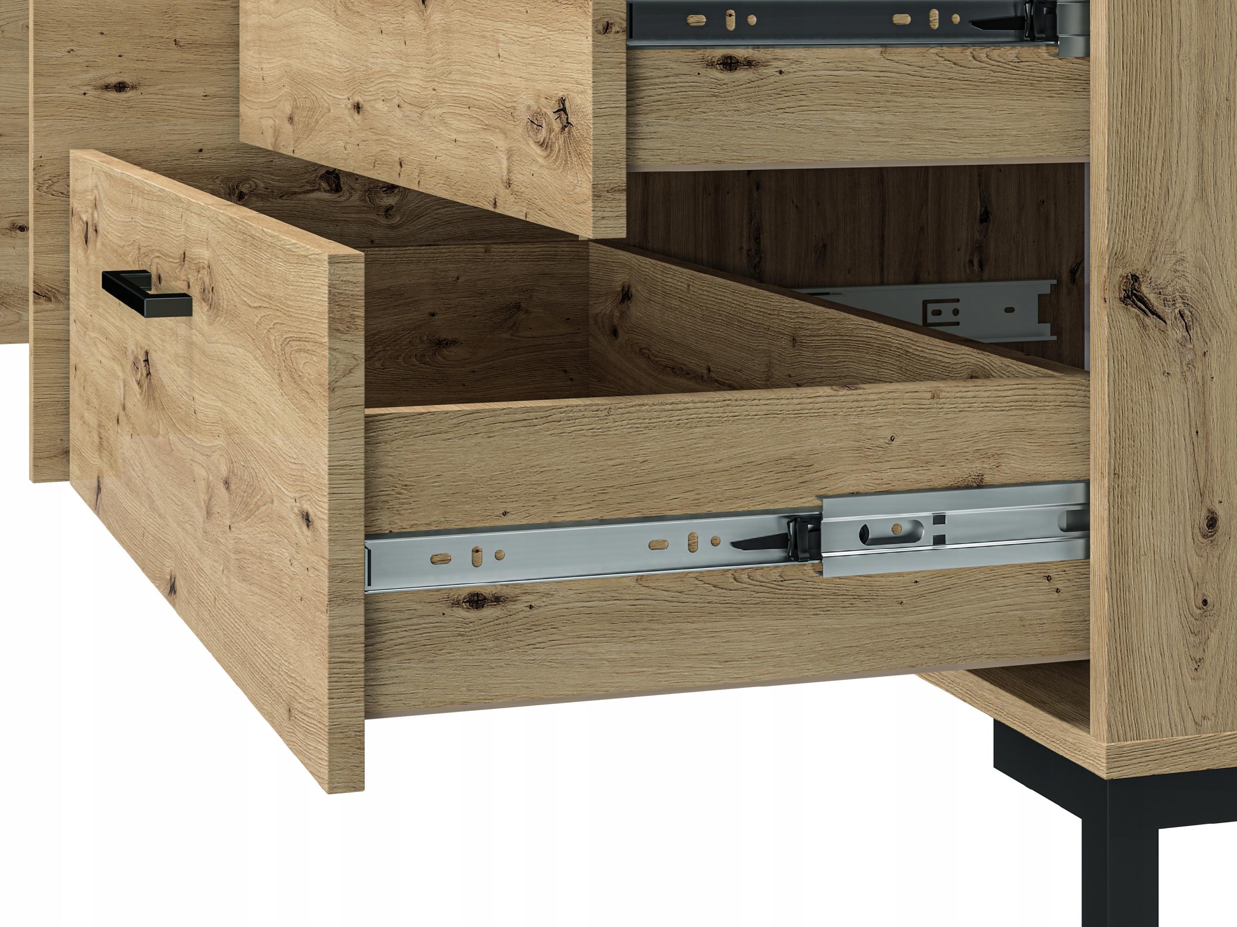 Komoda z serii NEVIO została wyposażona w trzy praktyczne szuflady oraz dwie zamykane szafki. Dodatkowym atutem szuflad jest ich pełen wysuw oraz wzmocnione dno.