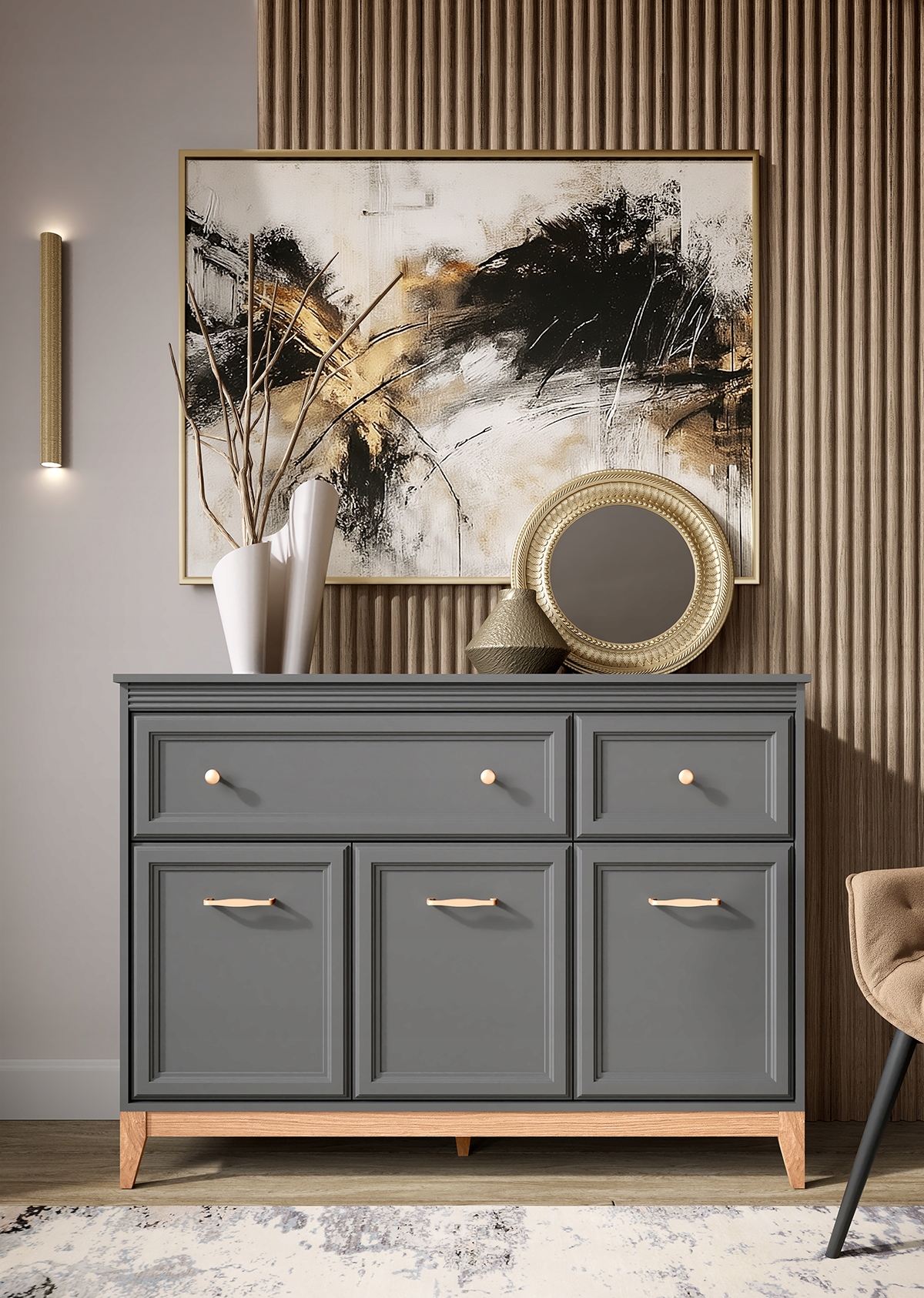 Komoda TERRA TA-1 to elegancki i funkcjonalny mebel, który doskonale sprawdzi się w salonie, sypialni lub jadalni. Klasyczna forma została wzbogacona o nowoczesne detale – frezowane fronty, metalowe uchwyty w kolorze różowego złota oraz naturalne drewniane nogi. Charakterystyczne dla kolekcji oświetlenie LED pod blatem, włączane dotykiem, tworzy subtelną poświatę i efekt lekko unoszącego się mebla.