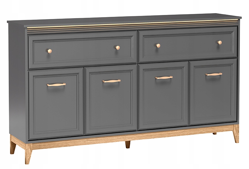 Komoda TERRA TA-2 to większa wersja modelu TA-1, zaprojektowana z myślą o przestronnych wnętrzach. Szeroka bryła zapewnia dużą powierzchnię przechowywania, a elegancki kolor Szary Diamentowy w połączeniu z naturalnym drewnem tworzy wyjątkowo harmonijną kompozycję.