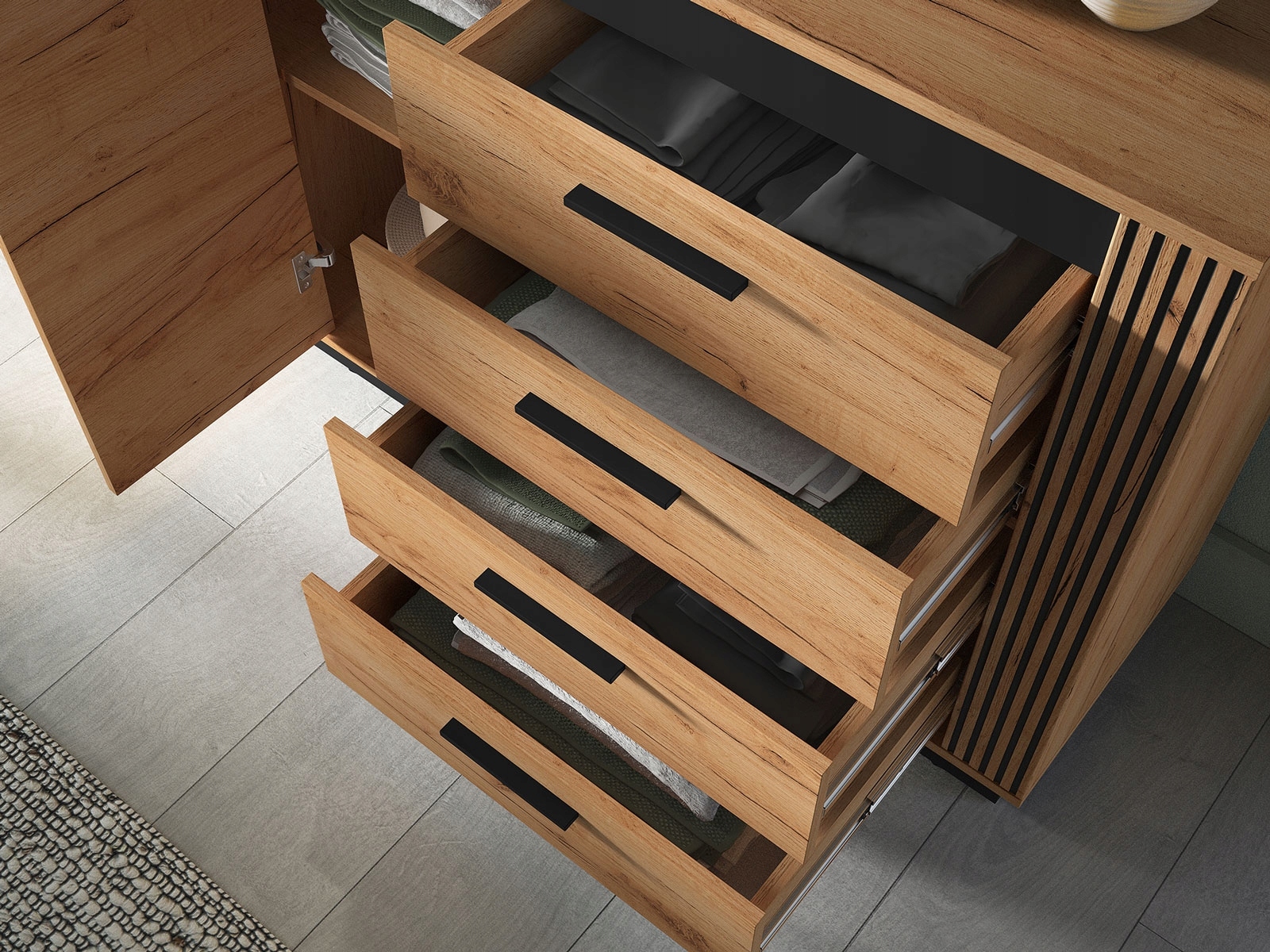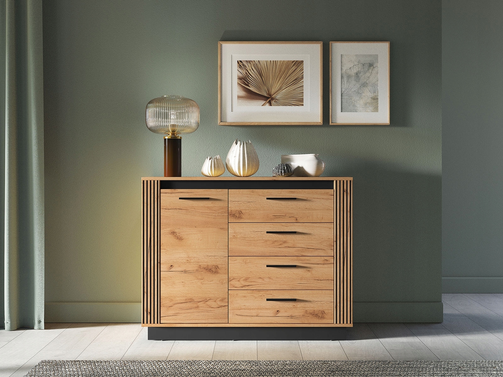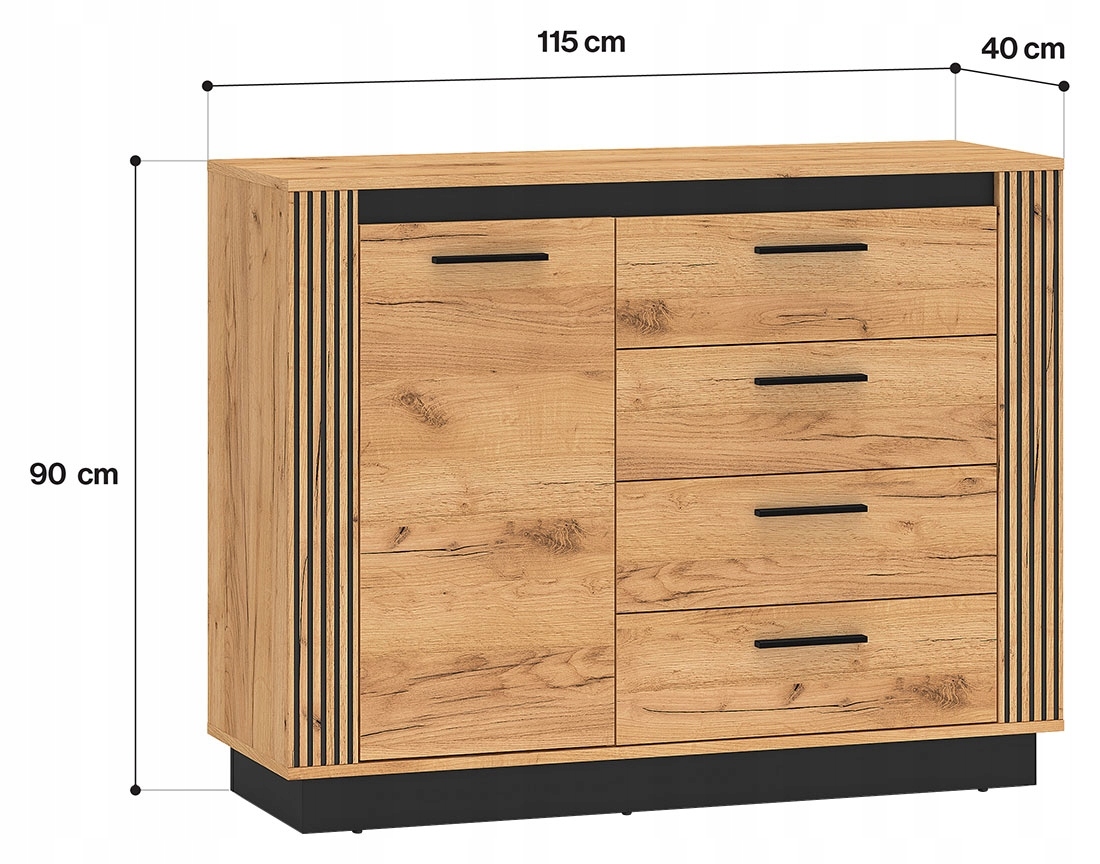 Nie wszystkie komody wysokie z szufladami wyróżniają się na tle innych mebli loftowych tak, jak model Urso 07. Prezentowany element kolekcji został wybarwiony na ciepły kolor dębu Craft Złotego, jednak dzięki czarnym detalom zyskuje surowy, wyrazisty charakter. Jego atut stanowią też akcenty ozdobne w postaci wąskich lameli, które stanowią modny i elegancki dodatek. Komoda pasuje do wnętrz industrialnych, loftowych, ale też skandynawskich. Dzięki niej można w prosty sposób odświeżyć aranżację i dodać jej oryginalności.