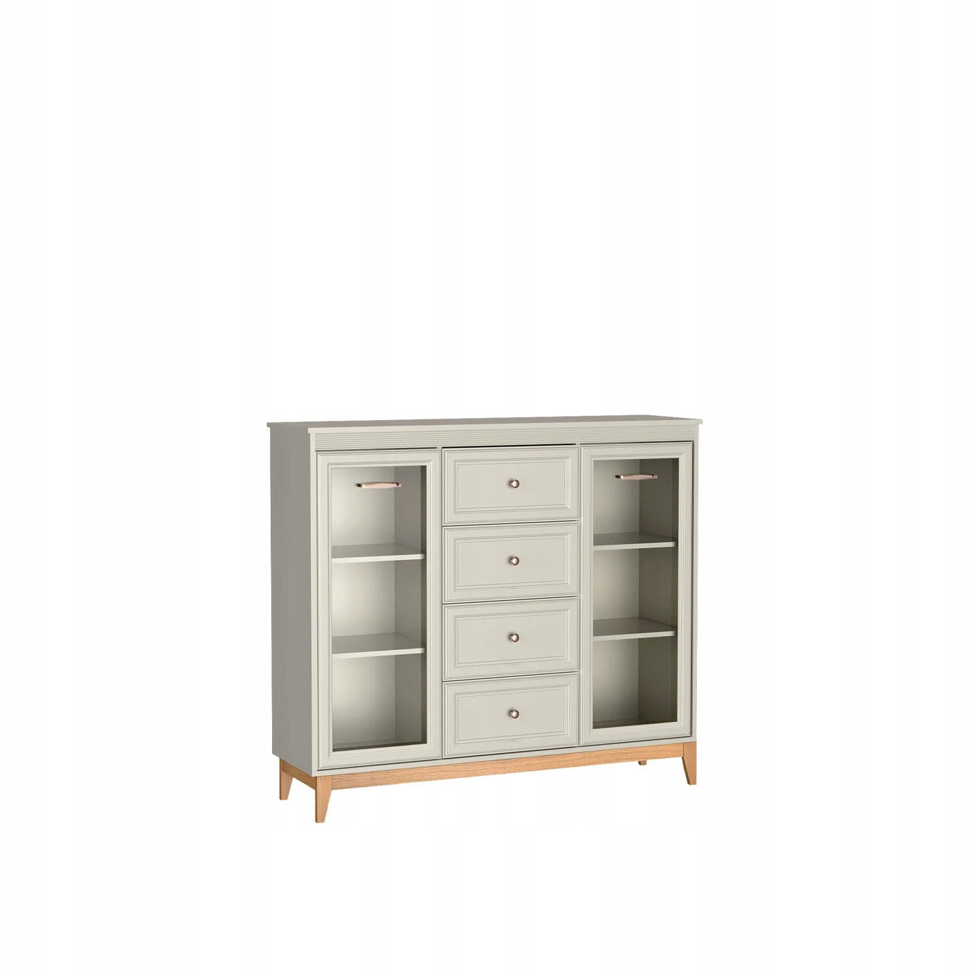 elegancka i funkcjonalna witryna, która łączy klasyczną estetykę z nowoczesnymi rozwiązaniami. Jej subtelna kolorystyka w odcieniu kaszmiru, zestawiona z drewnianymi akcentami, tworzy harmonijną i przytulną atmosferę w każdym wnętrzu. Dzięki przemyślanemu układowi oraz wysokiej jakości wykonaniu, witryna doskonale sprawdzi się w salonie, jadalni czy gabinecie, pełniąc zarówno funkcję dekoracyjną, jak i praktyczną.