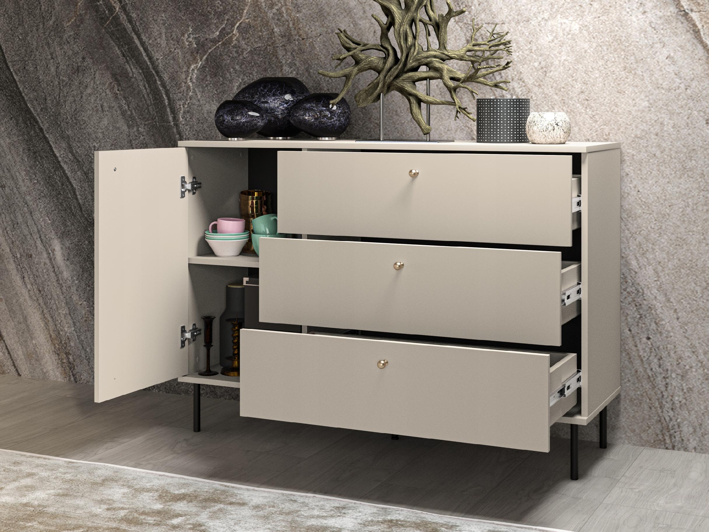 Komoda z kolekcji SOPHIE to połączenie subtelnego, ciepłego odcienia kaszmiru (cashmere) z efektownymi detalami.