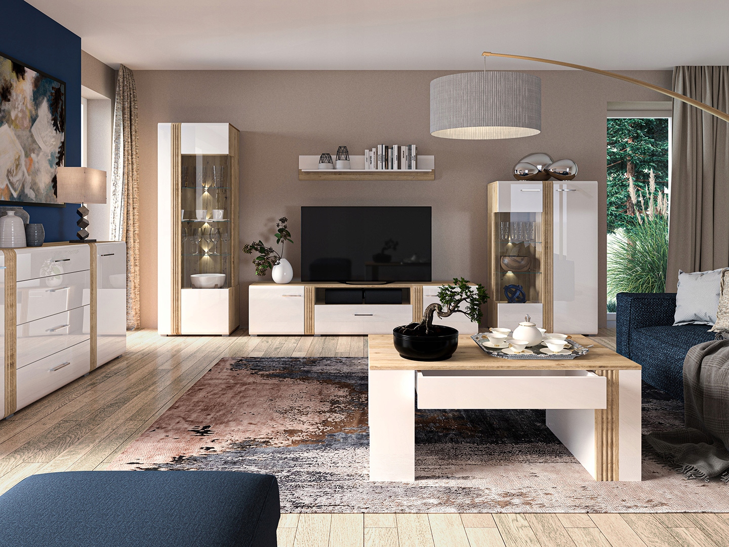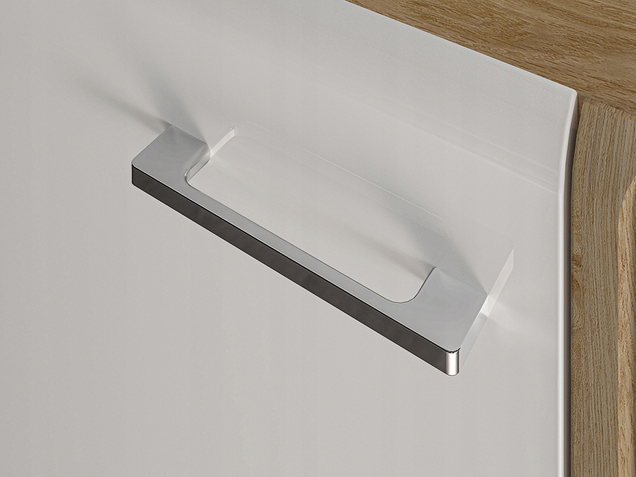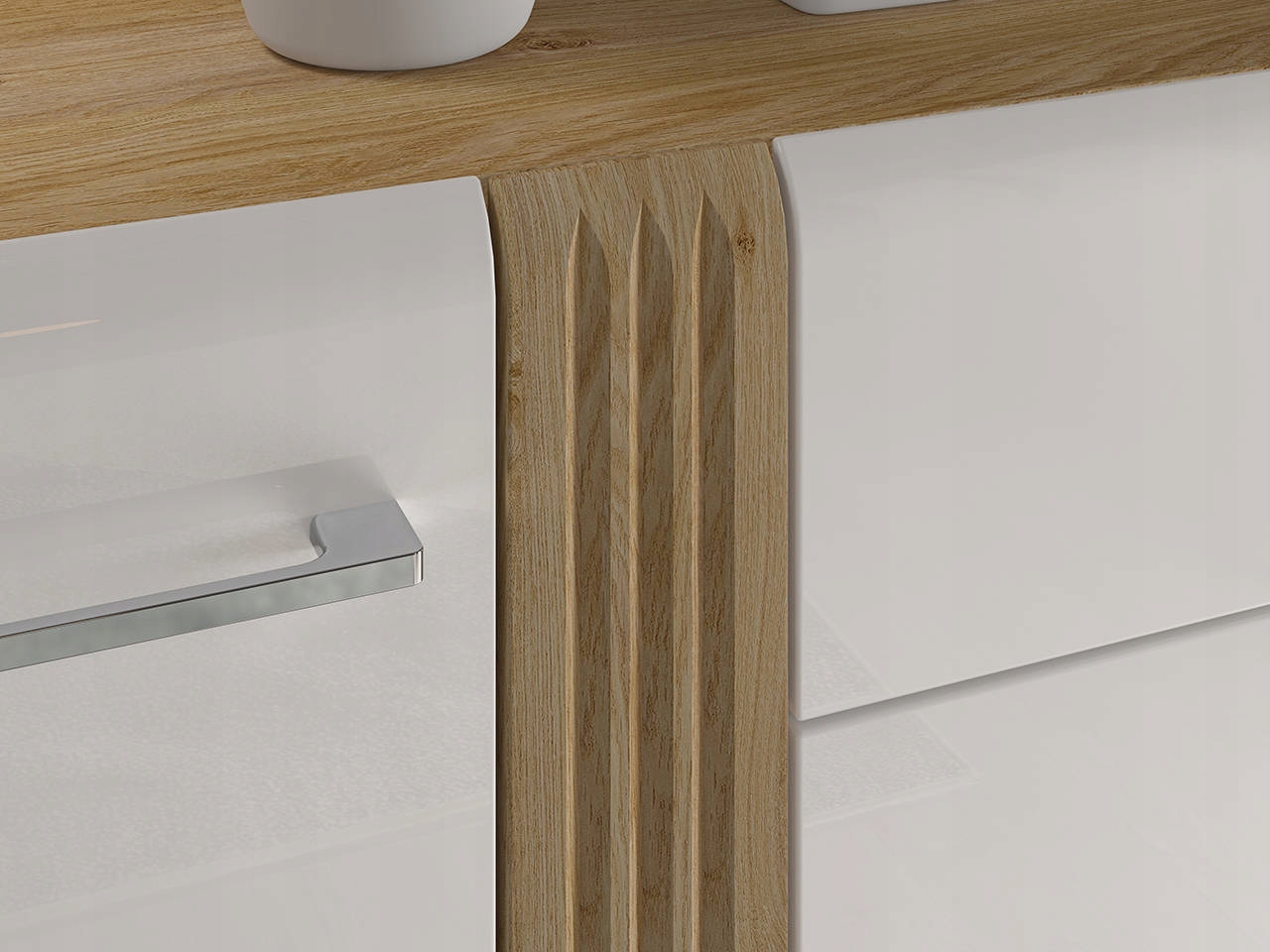 Biel frontów zestawiona z naturalną barwą korpusów tworzy połączenie, które dobrze wpisuje się zarówno w nowoczesne, jak i tradycyjne wnętrze. Gładka powierzchnia mebli oraz metalowe uchwyty odbijają światło, optycznie powiększając przestrzeń. Przeszklone, podświetlane witryny budują wyjątkowy nastrój we wnętrzu. Ryflowane wstawki o tym samym ciepłym odcieniu co korpusy nadają ciekawego wyglądu, a zaoblone ku górze fronty przełamują prostą linię kolekcji, wplatając nieco nowoczesnej klasyki.