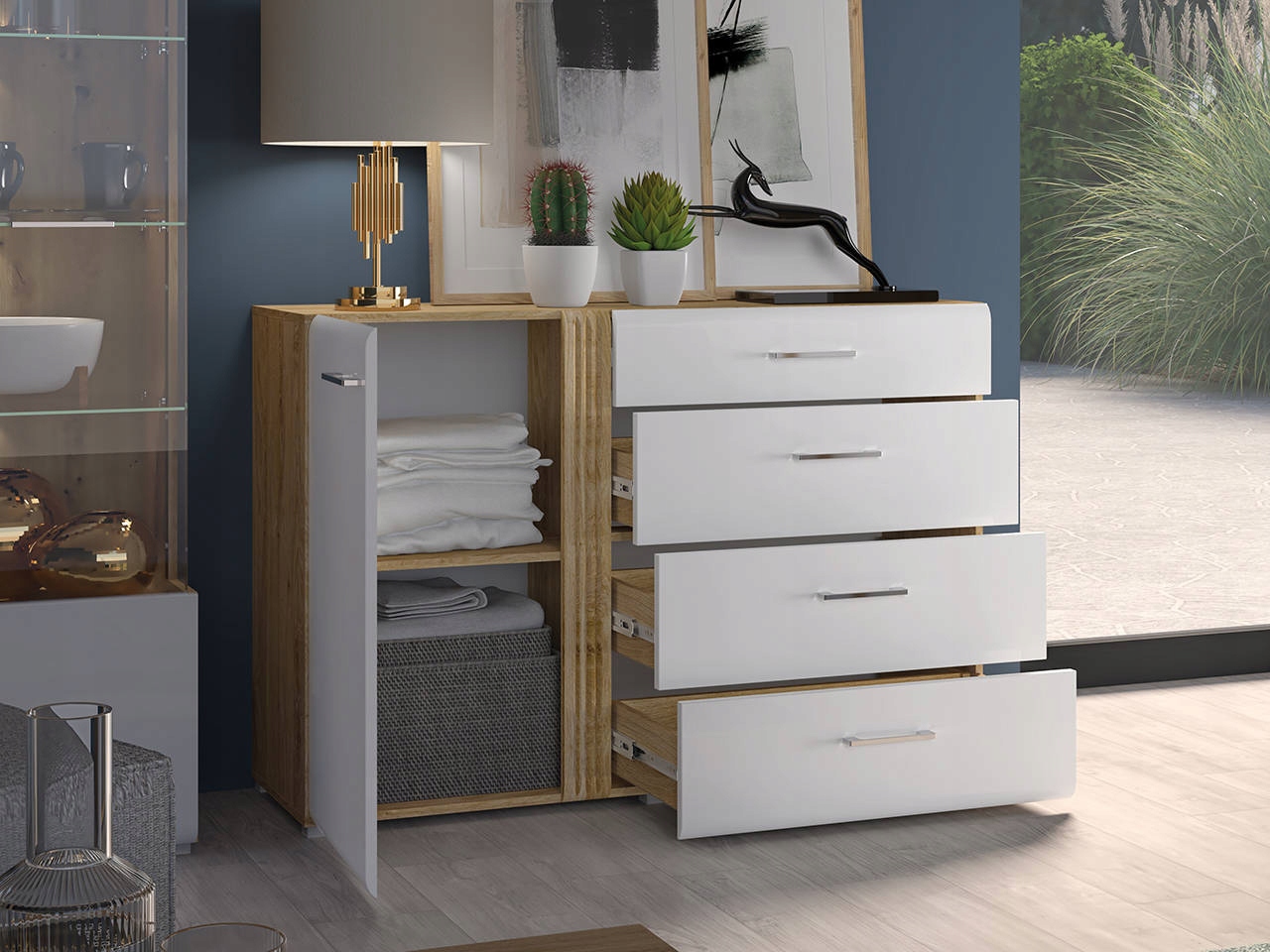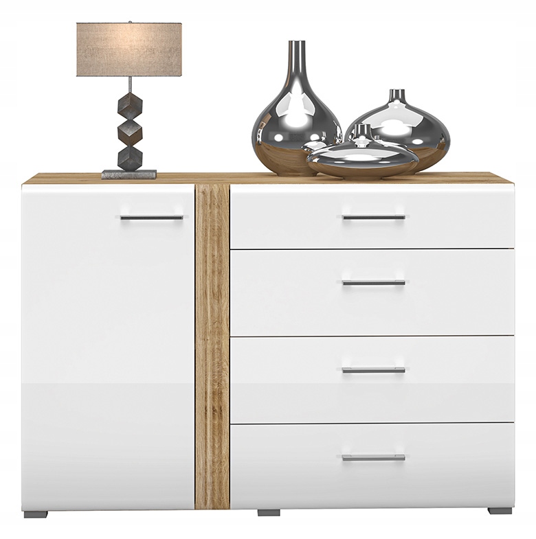 Praktyczna komoda ADAGIO wyposażona została w cztery szuflady oraz zamykaną szafkę z półką w środku.