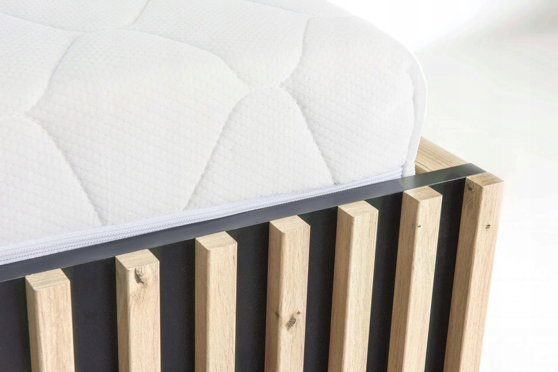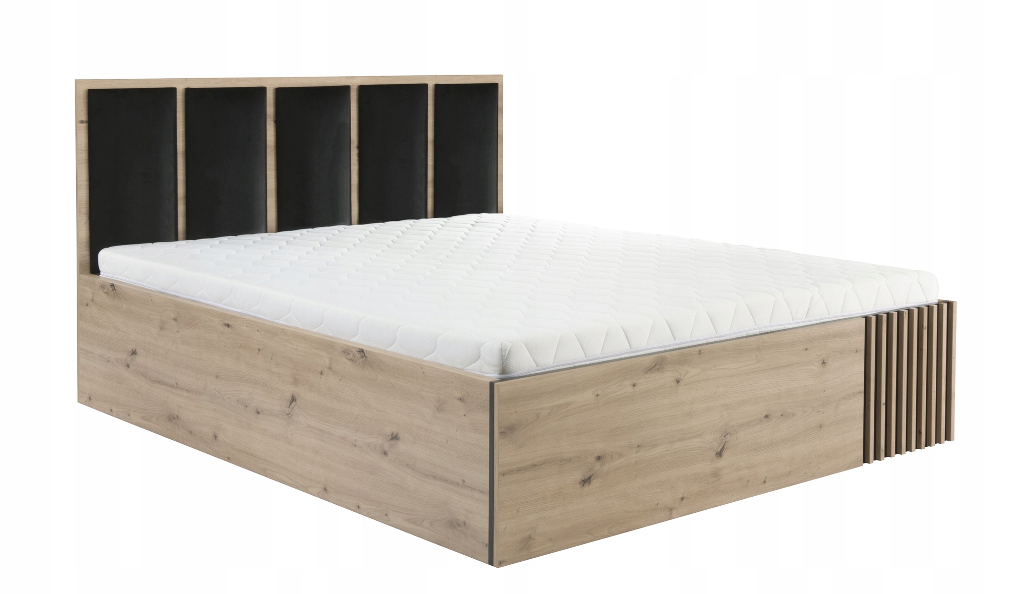 Najważniejszy mebel w sypialni? Bez wątpienia łóżko. Nie mogło więc go zabraknąć w naszej najnowszej kolekcji. Łączy w sobie unikatowy design oraz praktyczne rozwiązania. W części przedniej znalazły się niezwykle modne lamele. Zagłowie zdobią czarne, tapicerowane płyty. Pojemnik na pościel daje dodatkową, niezwykle cenną przestrzeń przechowywania. Stelaż na metalowej ramie oraz podnośniki gazowe uławiają użytkowanie oraz wzmacniają konstrukcję.