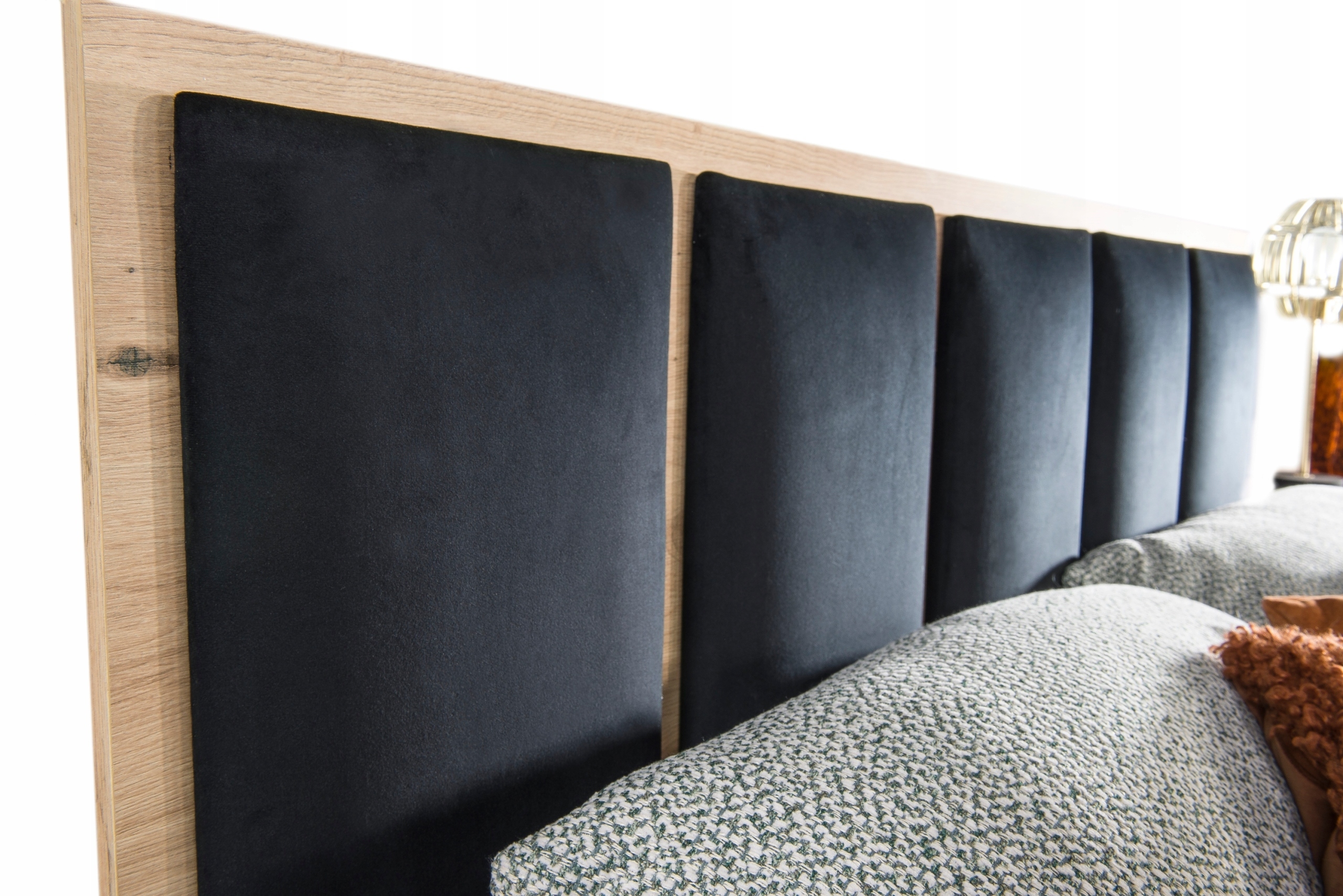 Łóżko z kolekcji CALI to stylowe i praktyczne rozwiązanie do każdej nowoczesnej sypialni. Wykończone w dekorze dąb artisan z kontrastującym czarnym, tapicerowanym zagłówkiem, łączy ciepło drewna z elegancją miękkiej tkaniny.