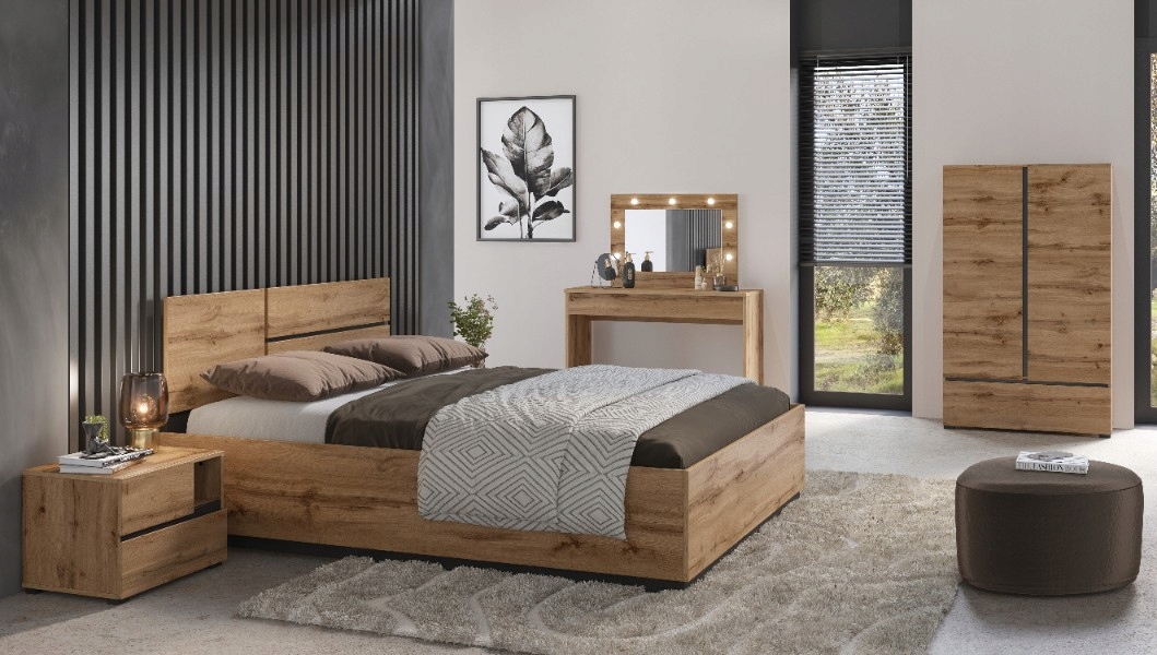 Stwórz przestrzeń pełną harmonii i naturalnego ciepła dzięki kolekcji mebli sypialnianych w kolorze dąb Wotan. Proste, geometryczne formy i oszczędna stylistyka podkreślają minimalistyczny charakter zestawu, idealnie wpisując się w nowoczesne wnętrza.