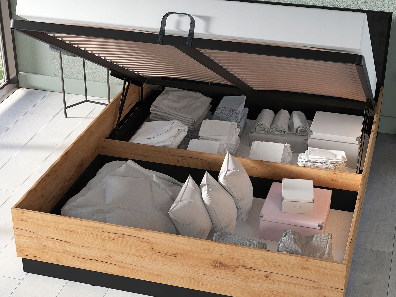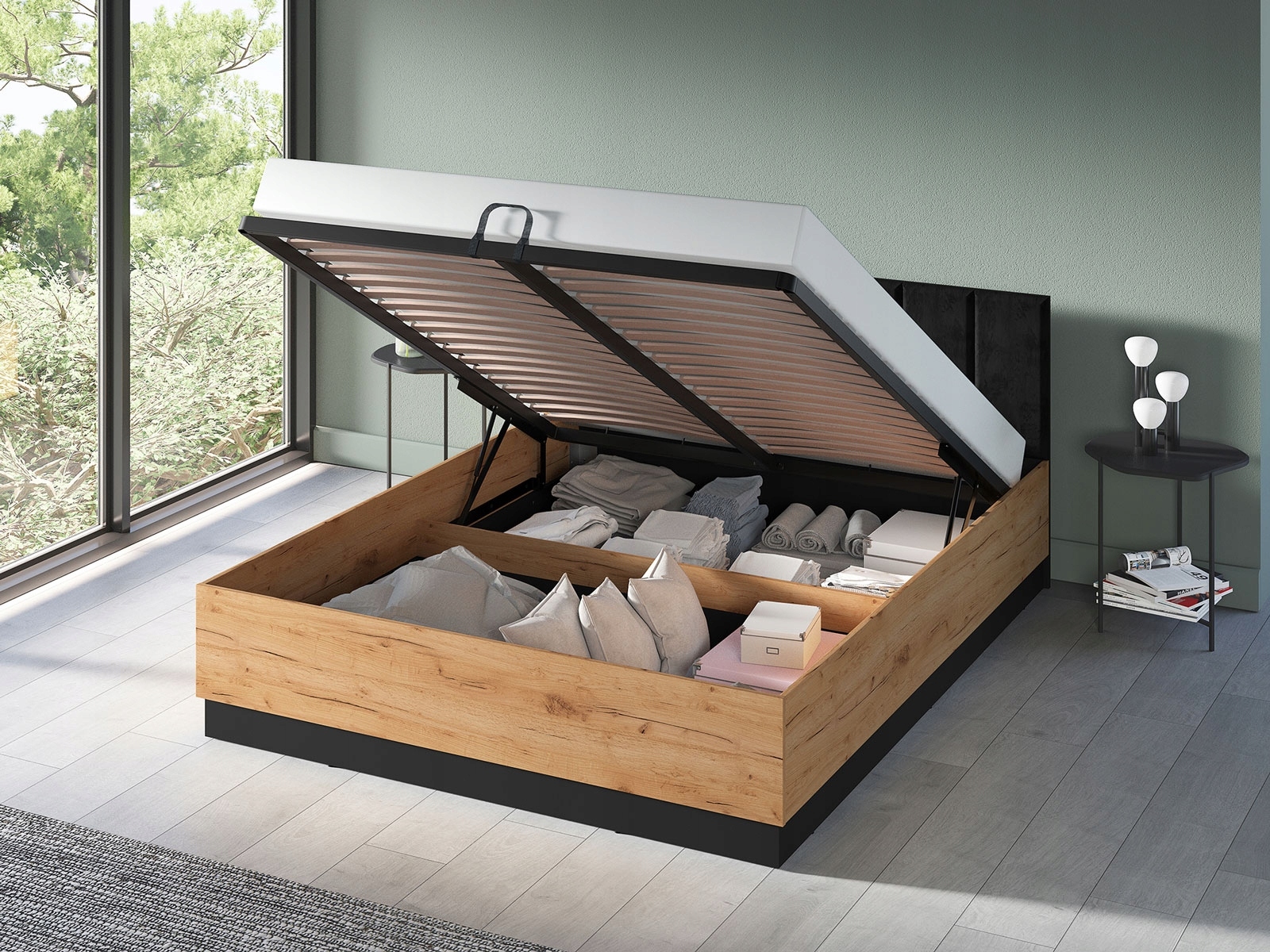 | Informacje dodatkowe | pojemnik na pościel otwierany do góry, ze stelażem, z zagłówkiem |