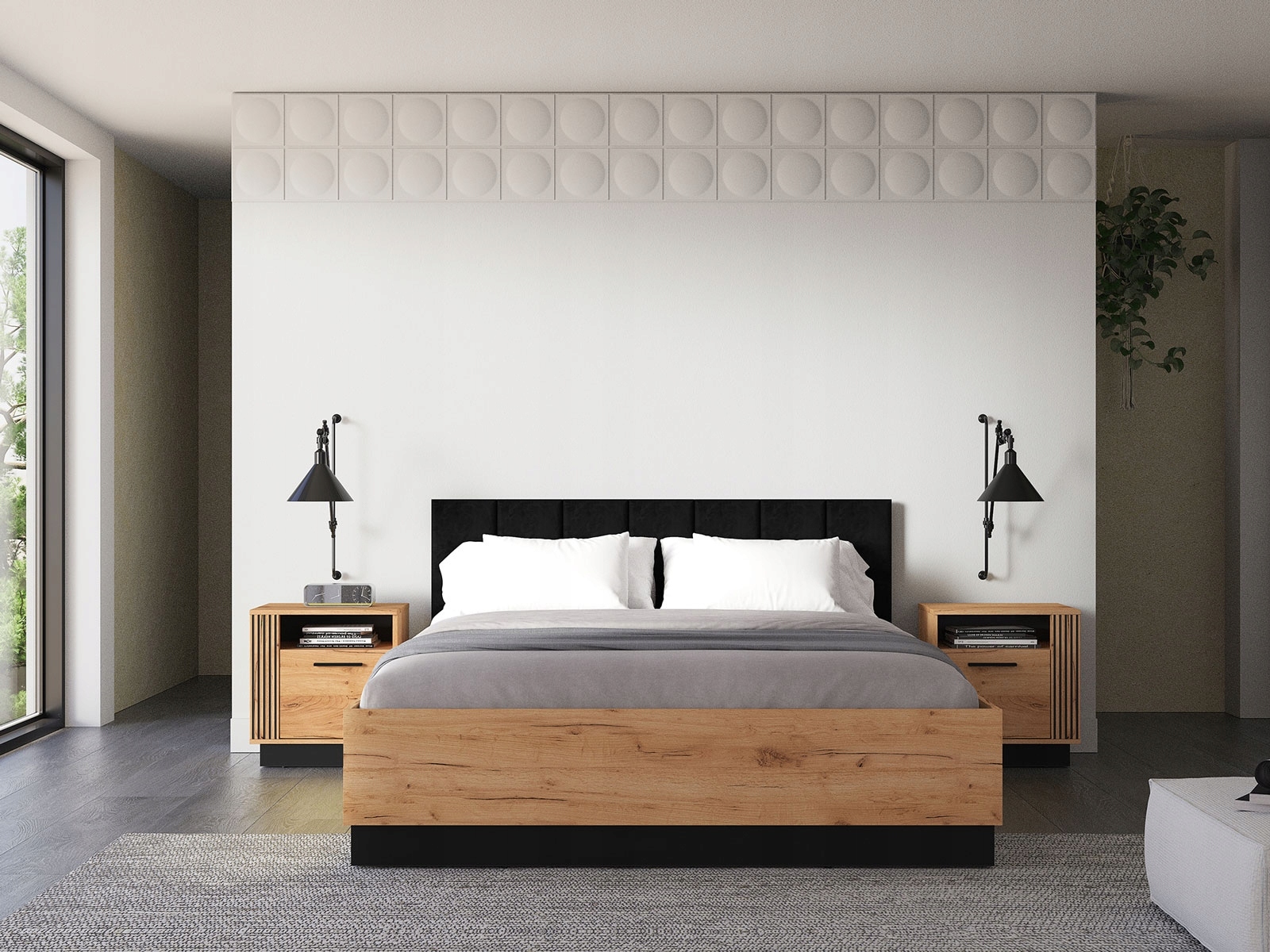 Prezentowane łóżko 160×200 z pojemnikiem z kolekcji Urso wpisuje się w charakter wnętrz loftowych i industrialnych. Wynika to z jego prostej budowy oraz kontrastującej kolorystyki. Rama mebla został wybarwiona na odcień dębu Craft Złotego, a zagłówek na głęboki czarny kolor. Dzięki temu łóżko prezentuje się nowocześnie, nieco surowo, ale też bardzo elegancko.