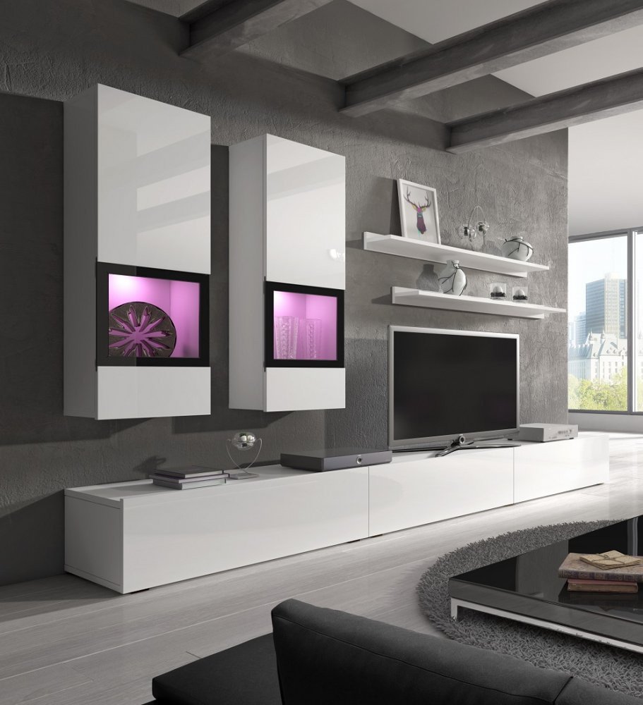 Meblościanka BAROS to eleganckie rozwiązanie zarówno do mniejszych, jak i większych salonów. Składa się z 2 witryn przeszklonych, 2 półek i 2 stolików pod telewizor. Zaletą witryn jest to, że można je zamontować na ścianie, dzięki czemu nie będą zajmować miejsca na podłodze, a także dodadzą pomieszczeniu lekkości. Części przeszklone wyposażone są w szkło hartowane. Kontrastowa oprawa podkreśla oryginalność projektu.