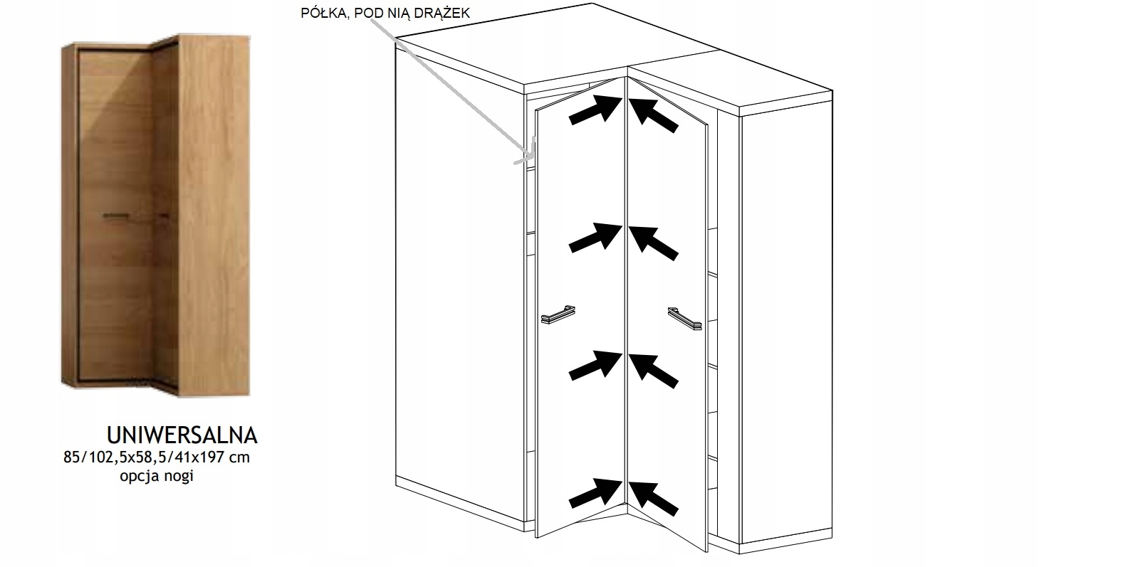 - Szafa narożna uniwersalna (do wyboru przy montażu wersja prawostronna lub lewostronna)