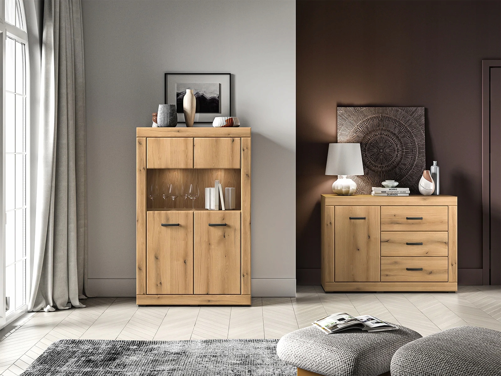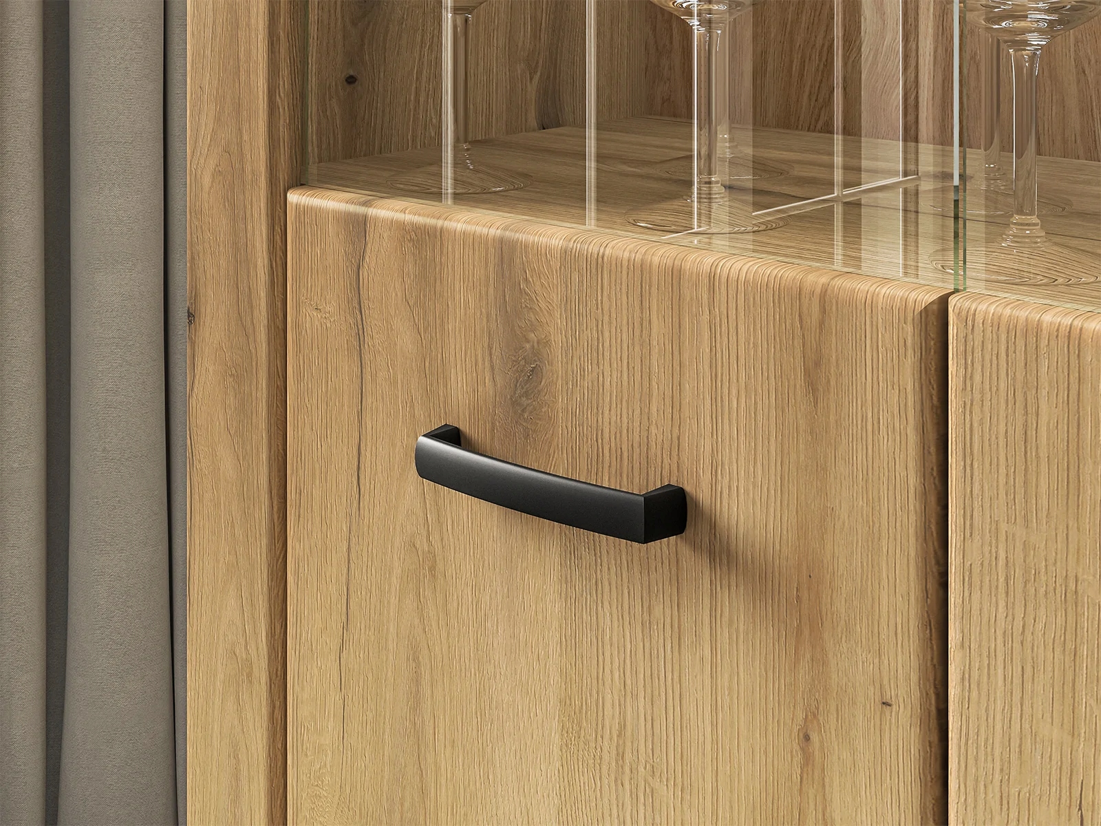 Dora to kolekcja pięknych i funkcjonalnych mebli do Twojego salonu. Bryły utrzymane są w naturalnej kolorystyce dębu Evoke. Wyraźny rysunek usłojenia podkreśla niepowtarzalny styl mebla. Oryginalnie zaoblone fronty oraz listwy z płyty MDF dodadzą wnętrzu przyjaznego charakteru i przytulności. Czarne uchwyty w połączeniu z dekorem o jasnym, drewnianym wzorze tworzą idealny, dopełniający się kontrast. Starannie wyselekcjonowane typy brył pozwolą zaaranżować wiele wnętrz, niezależnie od ich stylu czy metrażu. Wybierz meble Dora i wypełnij serce swojego domu unikalnym wzornictwem.