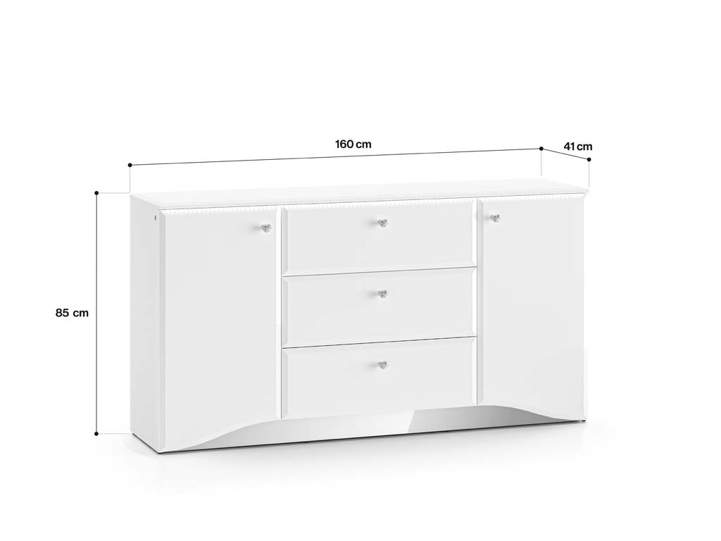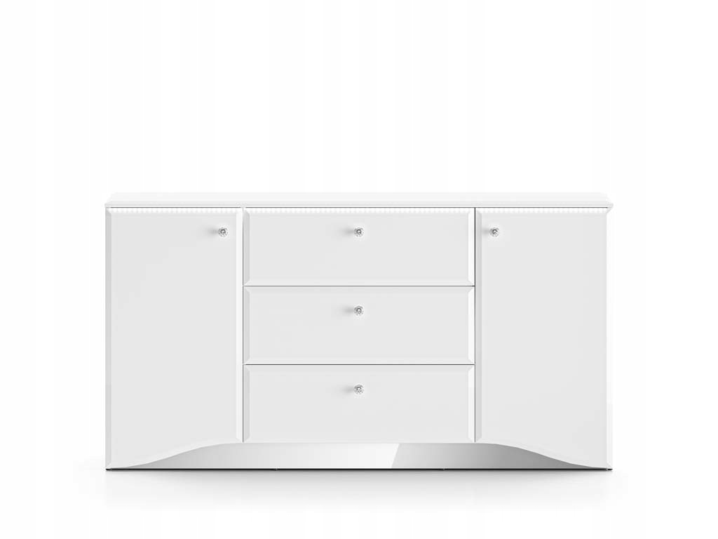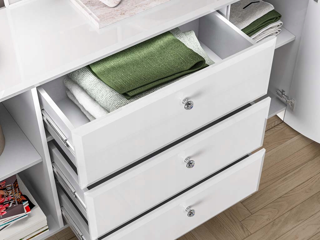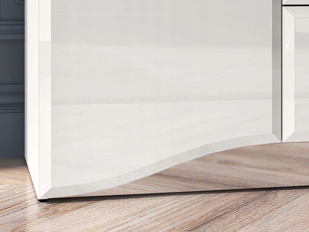 Zaokrąglone fronty z płyty MDF w białym połysku wprowadzają wrażenie lekkości, natomiast matowy korpus w białym odcieniu z trwałymi, ABS-owymi obrzeżami dodaje meblowi nowoczesnego wyglądu. Komoda wyposażona jest w trzy pojemne szuflady z pełnym wysuwem oraz dwie zamykane szafki, co zapewnia wygodne przechowywanie różnorodnych akcesoriów. System cichego domyku przesuwnych drzwi zwiększa komfort użytkowania, a chromowane uchwyty z elegancką imitacją diamentu subtelnie rozpraszają światło, dodając komodzie atrakcyjności.
