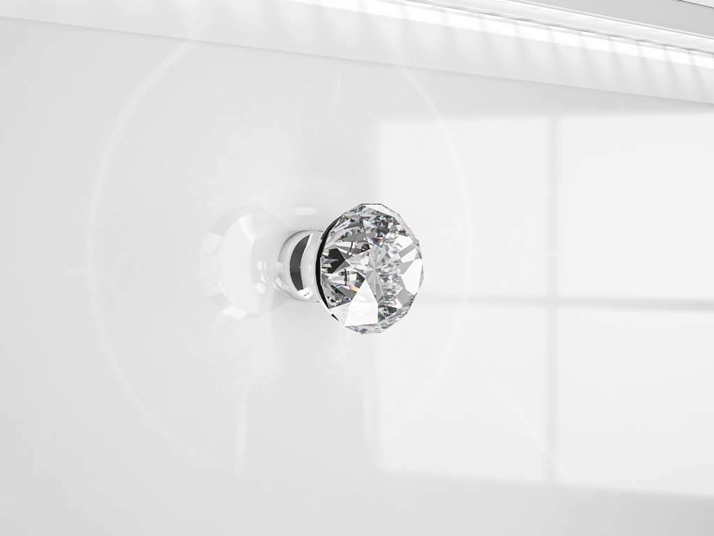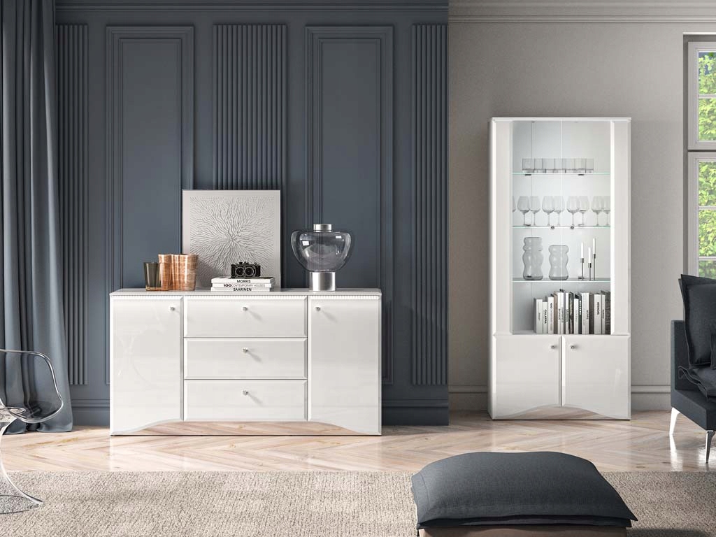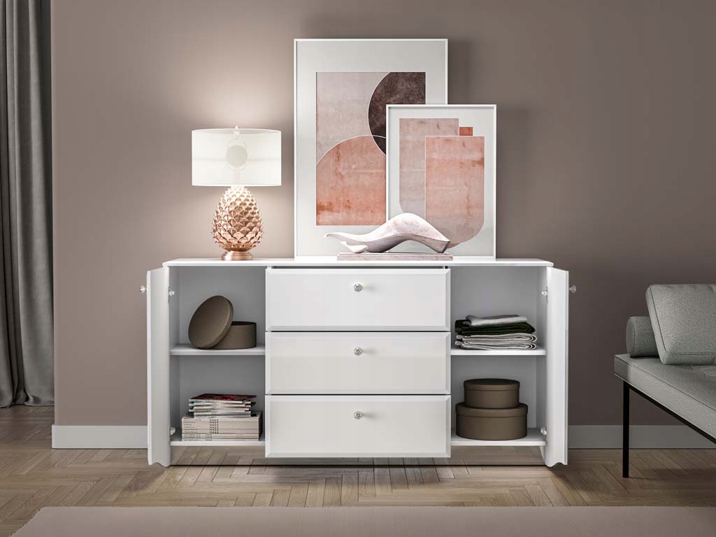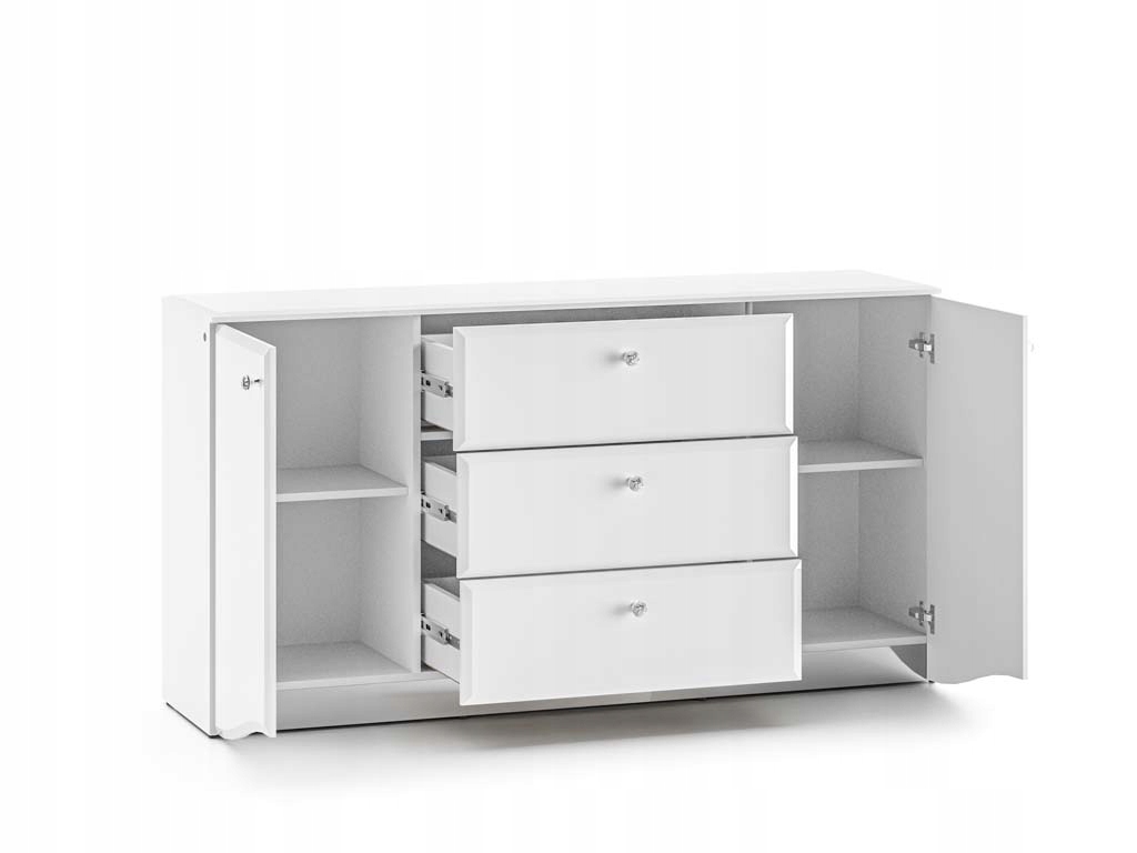 Zaokrąglone fronty z płyty MDF w białym połysku wprowadzają wrażenie lekkości, natomiast matowy korpus w białym odcieniu z trwałymi, ABS-owymi obrzeżami dodaje meblowi nowoczesnego wyglądu. Komoda wyposażona jest w trzy pojemne szuflady z pełnym wysuwem oraz dwie zamykane szafki, co zapewnia wygodne przechowywanie różnorodnych akcesoriów. System cichego domyku przesuwnych drzwi zwiększa komfort użytkowania, a chromowane uchwyty z elegancką imitacją diamentu subtelnie rozpraszają światło, dodając komodzie atrakcyjności.