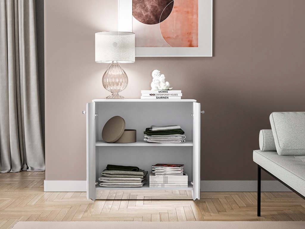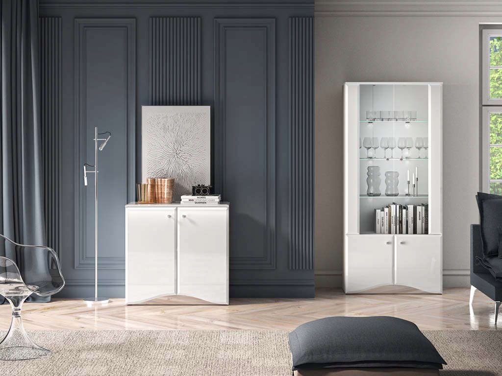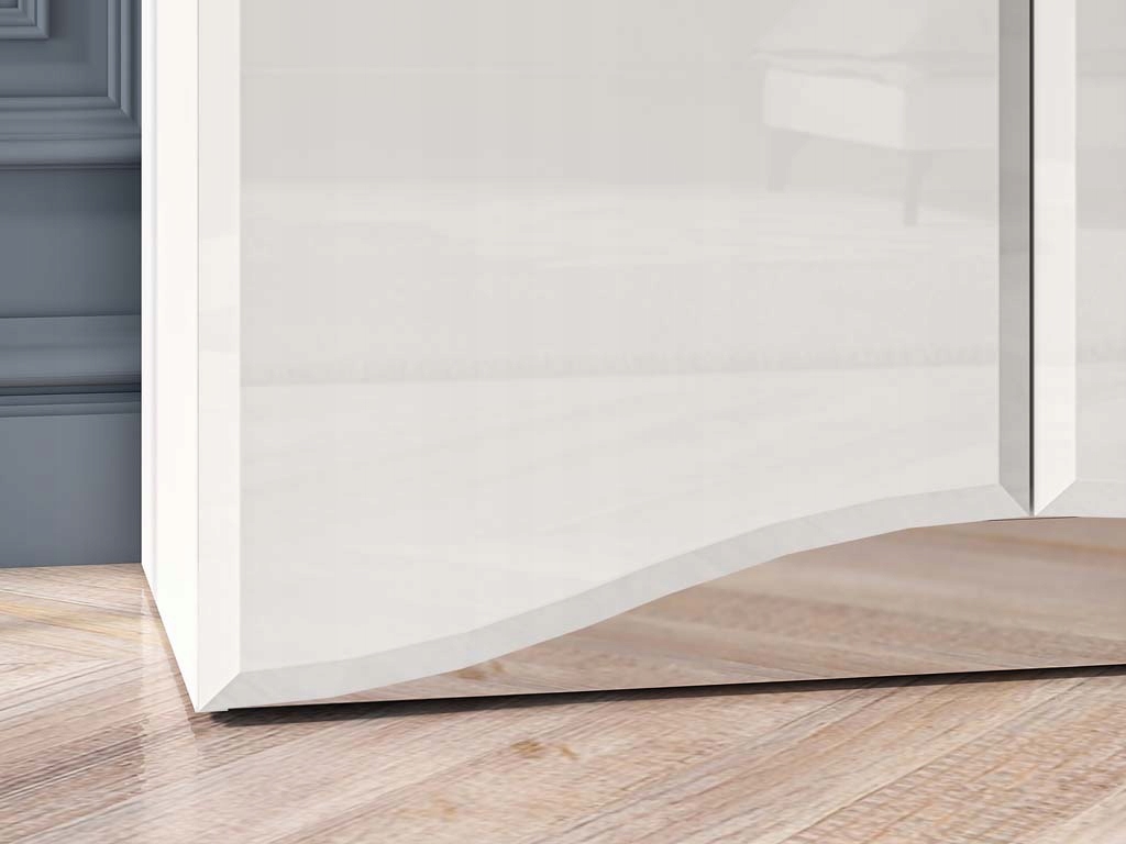GLAMOUR 09 Komoda idealnie sprawdzi się w różnych pomieszczeniach – w salonie, sypialni czy jadalni. Jej subtelne zaokrąglone fronty w białym połysku oraz lustrzany cokół, dodają lekkości i sprawiają, że komoda staje się nie tylko praktycznym meblem, ale również wyjątkowym dodatkiem do Twojego wnętrza.