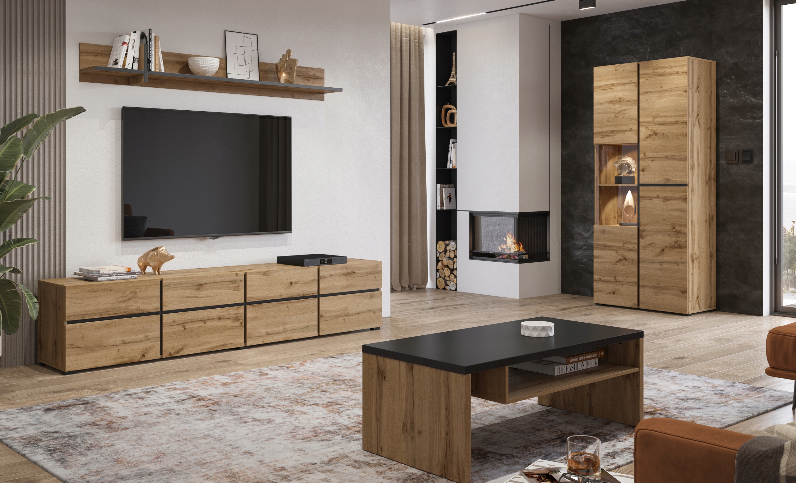 Szlachetny odcień dębu Wotan, z wyraźnie zaznaczonym usłojeniem, wnosi do pomieszczenia przytulność i lekkość, zachowując jednocześnie surową, naturalną estetykę. Meble pozbawione zbędnych zdobień – bezuchwytowe fronty, gładkie powierzchnie i subtelne linie – podkreślają nowoczesny styl aranżacji i pozwalają na stworzenie przestrzeni sprzyjającej relaksowi.