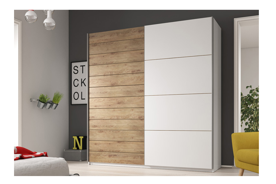 Szafa Galaxy 19 to duża, 2-drzwiowa szafa wykonana z wysokogatunkowego laminatu łączącego dwa modne kolory. Prezentuje się bardzo stylowo i nowocześnie, przez co sypialnia zyskuje akcent elegancji. Wnętrze bryły przedzielone zostało na 3 części, z których lewa i środkowa zawieraja półkę i drążek poniżej, prawa zaś 4 szerokie półki. System drzwi przesuwnych pozwala umiejscowić mebel w dowolnym miejscu, bez obaw o brak przestrzeni do uchylenia frontów.