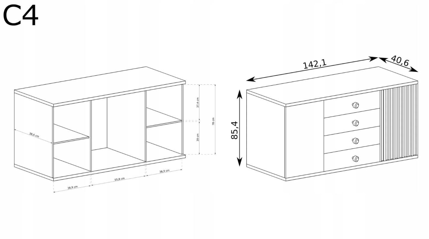 - Cztery głębokie szuflady pomieszczą ubrania, bieliznę lub dokumenty.