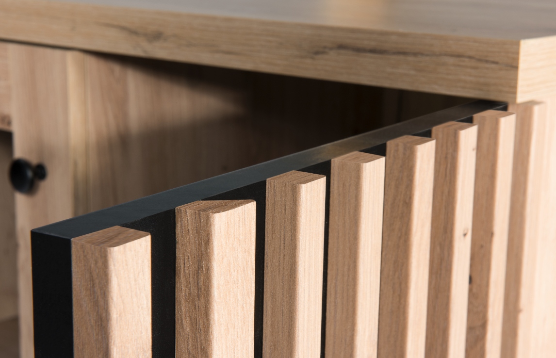 - Ozdobne lamele na czarnym tle dodają komodzie nowoczesnej, eleganckiej estetyki.