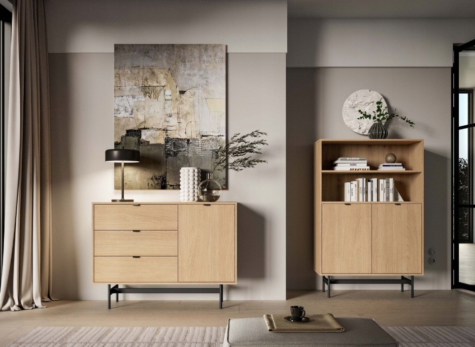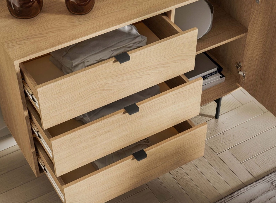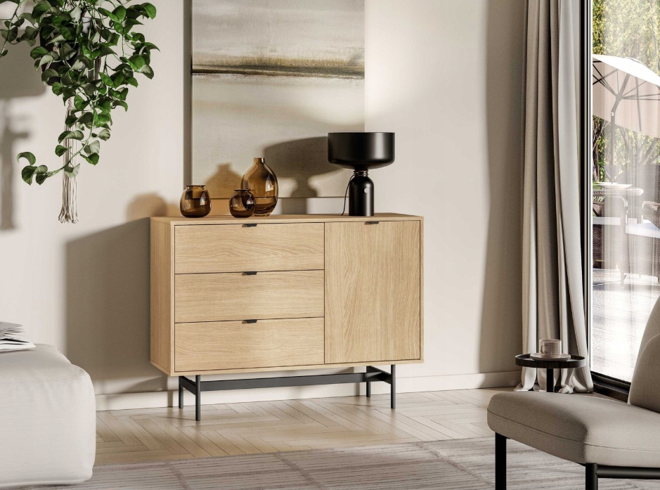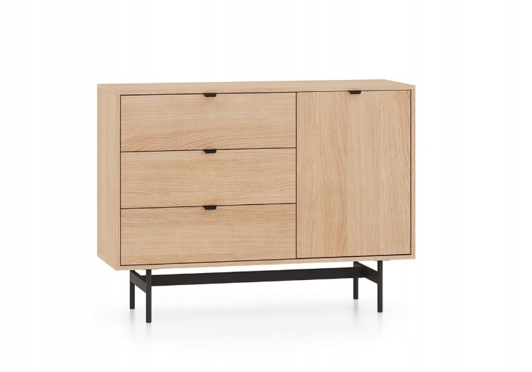 Mała komoda Reynos 04 to kompaktowe rozwiązanie, które sprawdzi się tam, gdzie liczy się każdy centymetr powierzchni. Zestawienie trzech głębokich szuflad z jedną boczną szafką pozwala na bardzo precyzyjną segregację przechowywanych rzeczy. To idealny mebel do salonu lub sypialni. Wysokie nóżki nadają bryle nowoczesnego sznytu i sprawiają, że nawet w małym pomieszczeniu mebel prezentuje się lekko i stylowo.