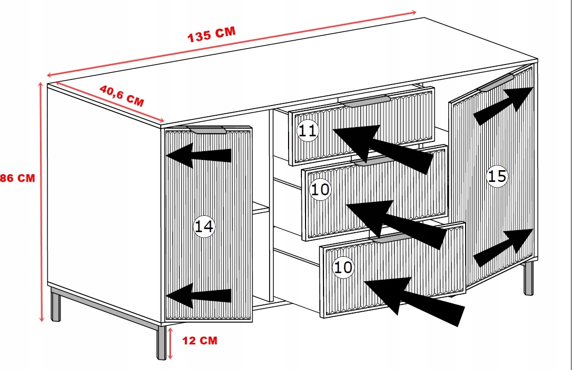 Nowoczesna komoda, w której znajdziemy 3 pojemne szuflady w centrum mebla i dwie szafki z półką, dzięki czemu staje się bardzo funkcjonalna. Pomieści wiele ubrań, akcesoriów czy dokumentów.