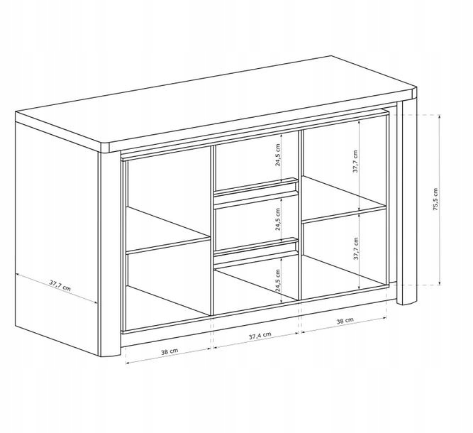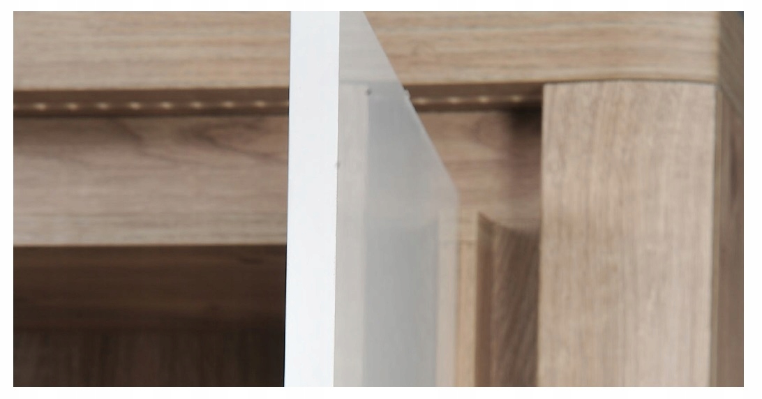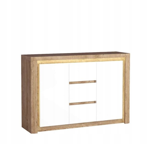 Nowatorska komoda z trzema szufladami w środkowej części i dwoma szafkami. Cudowny, naturalny kolor ribbeck w połączeniu z białymi frontami w połysku. Komoda jest bardzo duża i pojemna. Doskonale pasować będzie do sypialni czy pokoju dziecięcego. Zastosowane w niej zawiasy i prowadnice z cichym domykiem nie spowodują, ze musisz martwić się czy kogoś nie obudzisz. Każda z szaf ma po jednej półce, dzięki czemu zyskujemy miejsce do przechowywania. Komoda w zestawie ma oświetlenie, które wieczorem umili relaks przy naturalnej, ciepłej barwie LEDów.