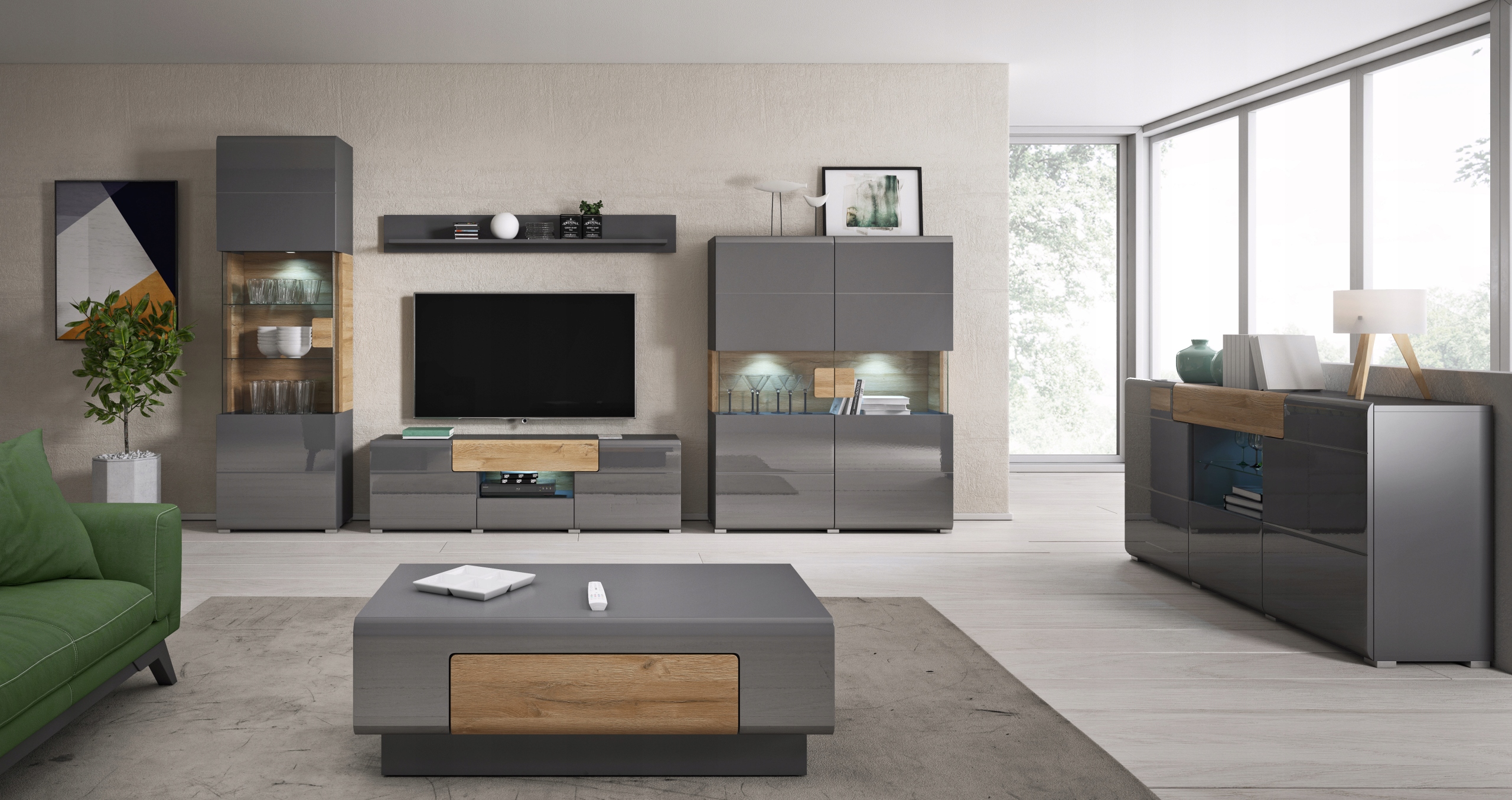 Efektownie połączone kolory, przykuwające uwagę uchwyty zamontowane w witrynach i szafie oraz delikatne poziome frezowania sprawią, że kolekcja Toledo stanie się ozdobą każdego salonu. Fronty wykonane zostały z płyty MDF pokrytej folią membranową zapewniającą trwałość na lata. Szuflady posiadają funkcje pełnego wysuwu, a hartowane szkło w komodach i witrynach zapewnia bezpieczeństwo. To idealny zestaw mebli do nowoczesnego salonu i pokoju dziennego.