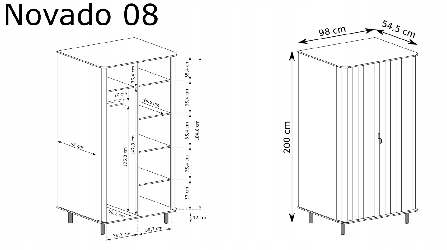 Wnętrze szafy zostało zaprojektowane z myślą o maksymalnej wygodzie użytkowania – prawa strona oferuje cztery pojemne półki, idealne na swetry, pościel czy pudełka, natomiast po lewej stronie znajduje się półka z drążkiem na ubrania wiszące. Dzięki temu z łatwością utrzymasz porządek i posegregujesz rzeczy zgodnie ze swoimi potrzebami.