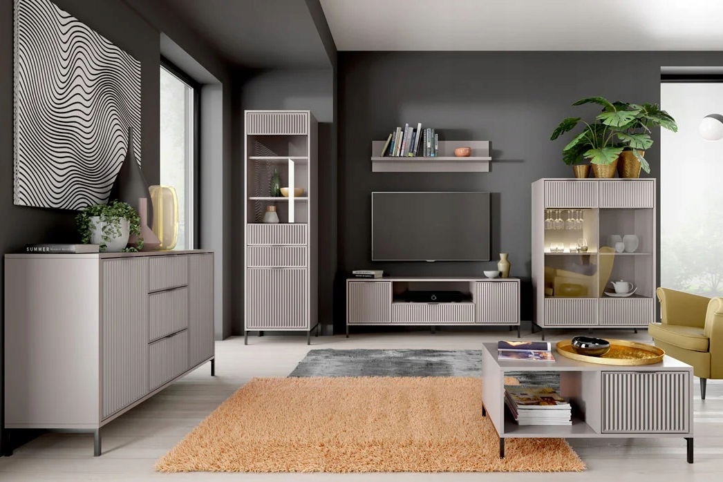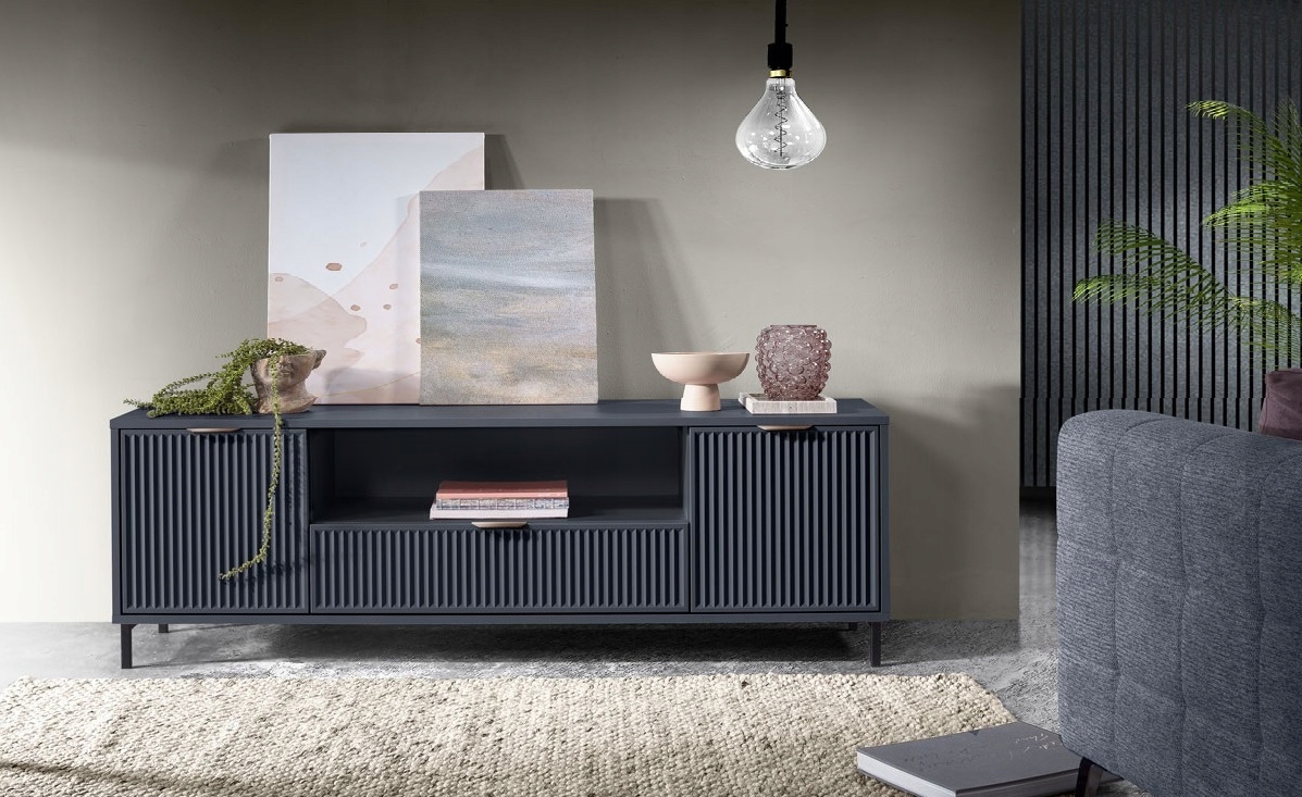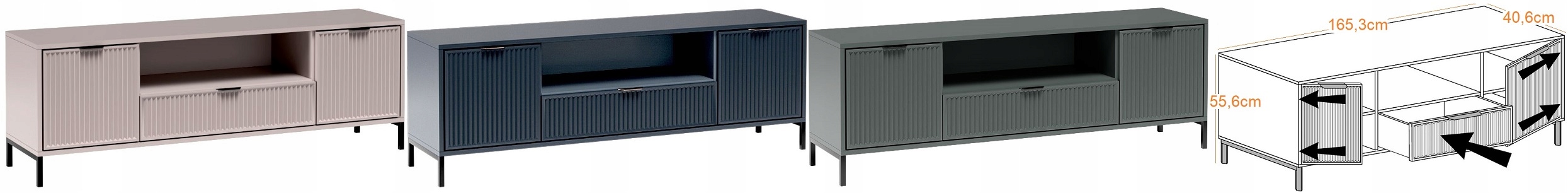 Nowoczesna szafka RTV z designerskim wykończeniem. Środkowa część to praktyczna półka na dekoder, czy inny sprzęt RTV, pod nią pojemna szuflada na różne drobiazgi. Po bokach dwie szafki na dodatkowe rzeczy. Szafka w połączniu z innymi meblami w salonie stworzą piękne wnętrze. Dostępna w trzech kolorach – cashmere/indigo/green stone.